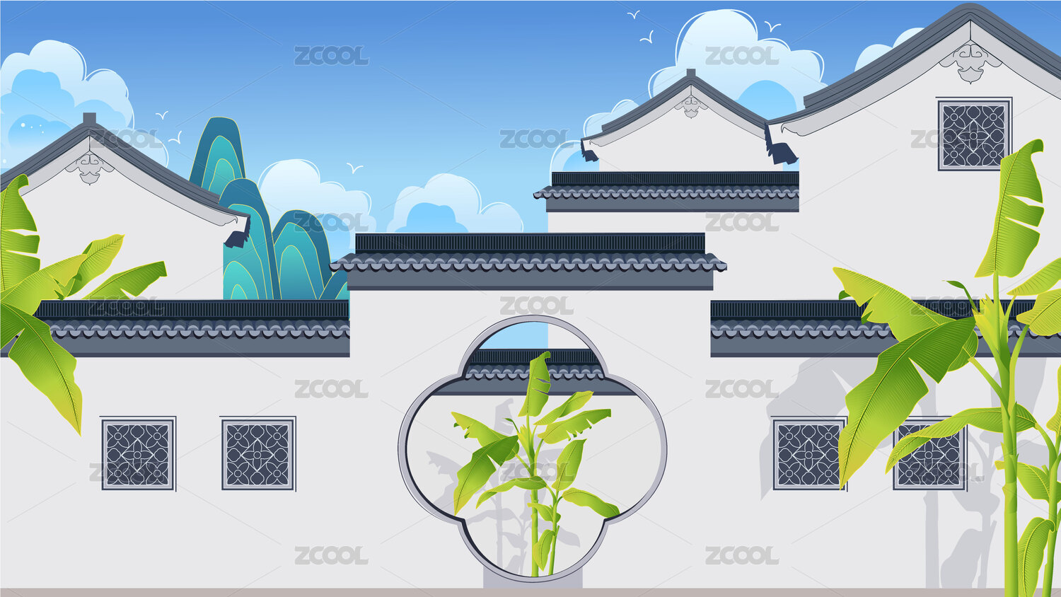 中式古典建筑馬頭墻邊上種著芭蕉葉矢量插畫