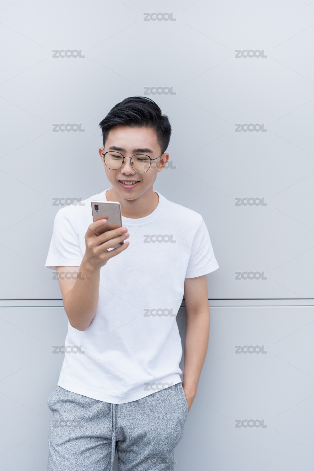 一名年輕的商務(wù)男士站在墻邊使用手機