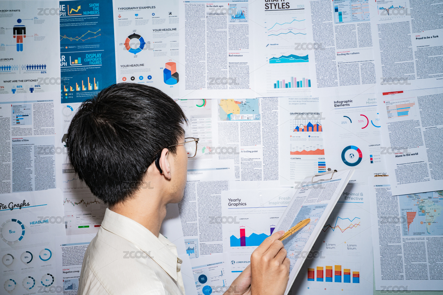 金融人士站在墻邊看著墻上的金融圖表報表資料思考分析投資方向概念