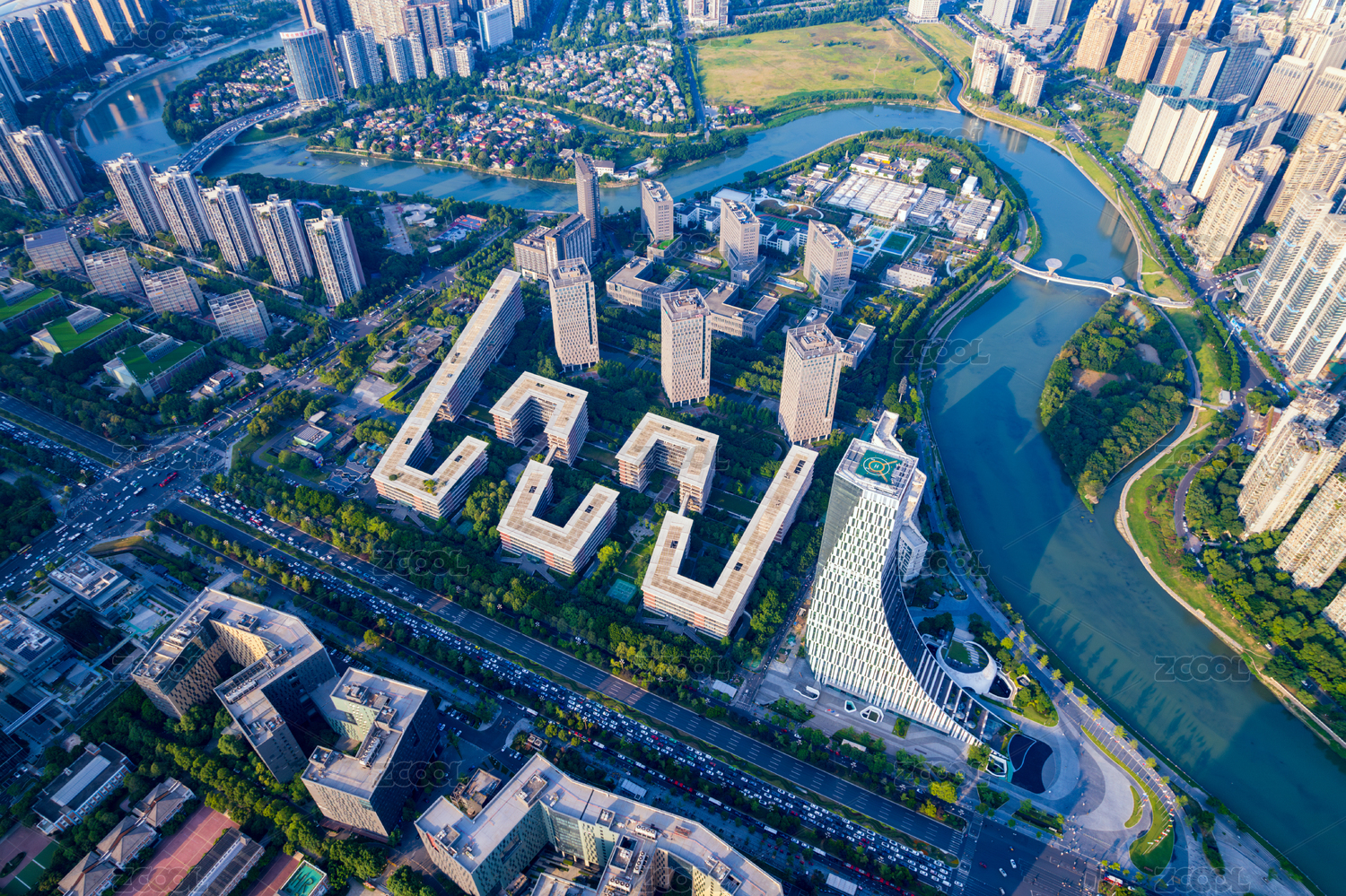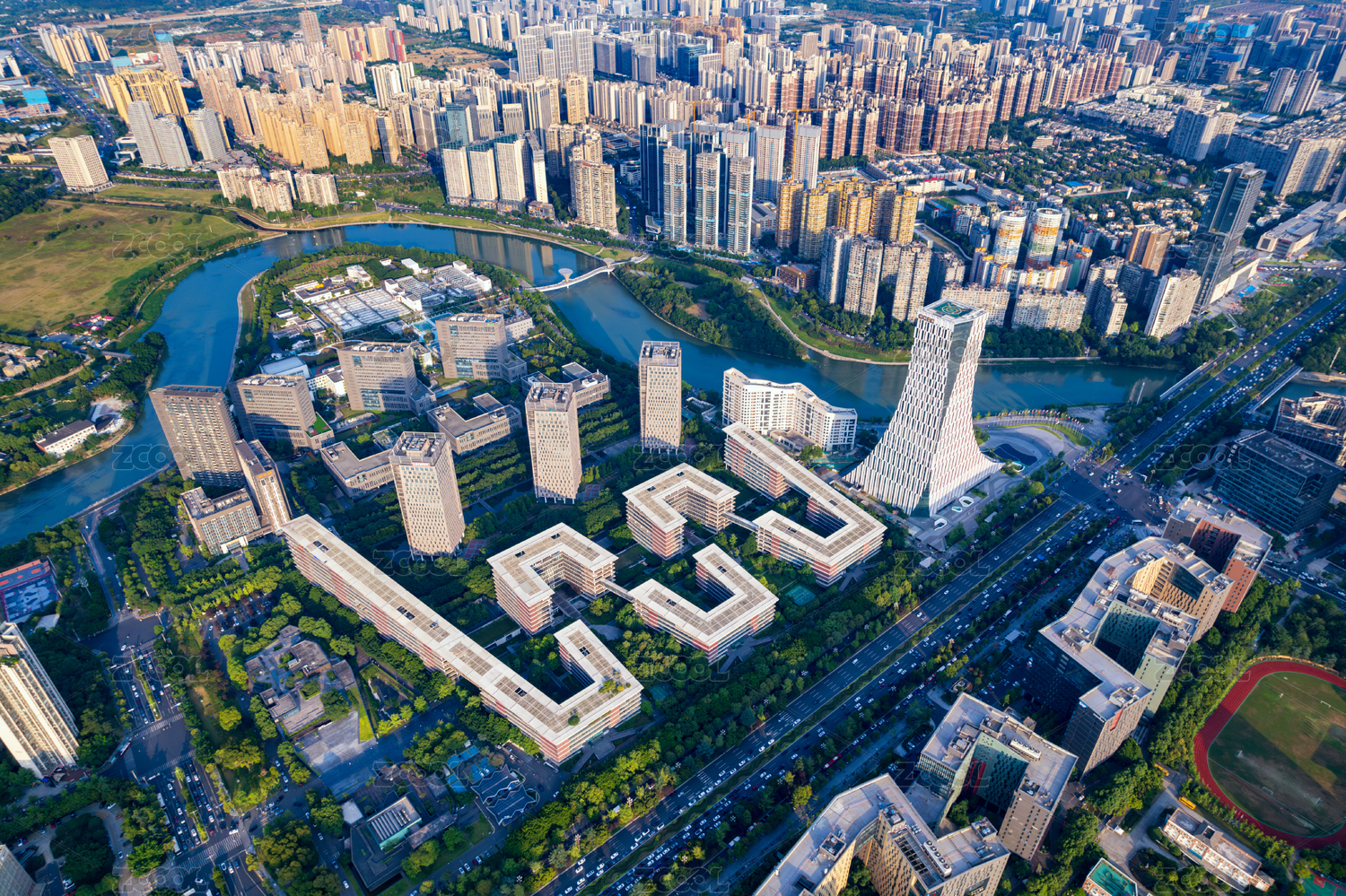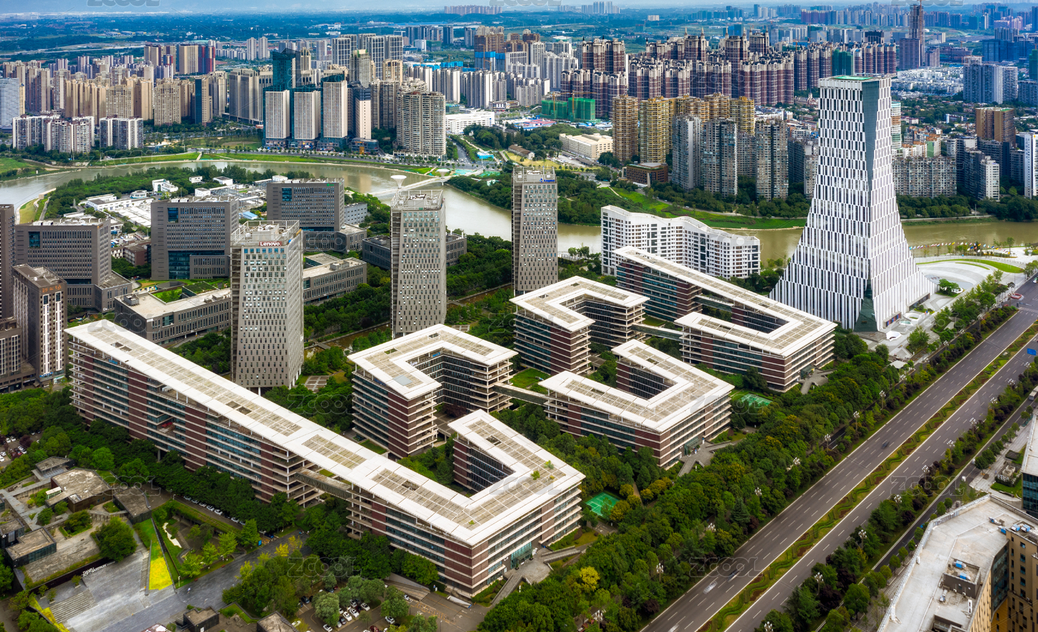 成都高新區(qū)錦江邊的天府軟件園和高層住宅樓