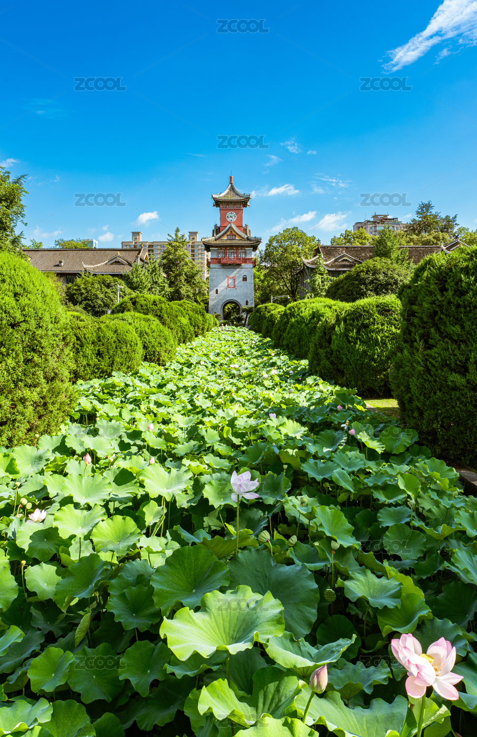 中國四川成都四川大學(xué)華西校區(qū)荷花池和鐘樓建筑