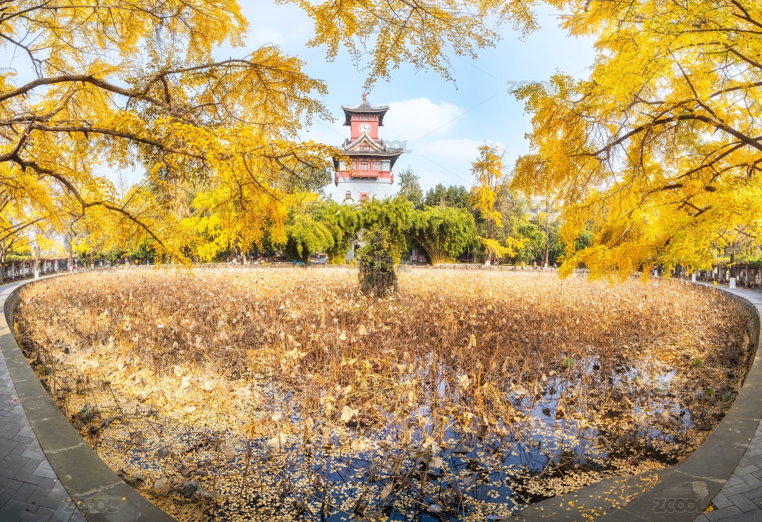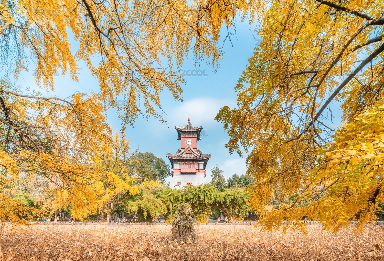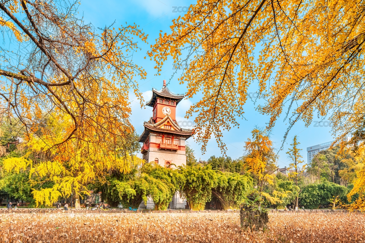 中國成都四川大學(xué)華西校區(qū)鐘樓銀杏樹秋色