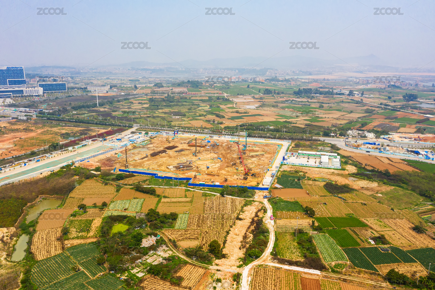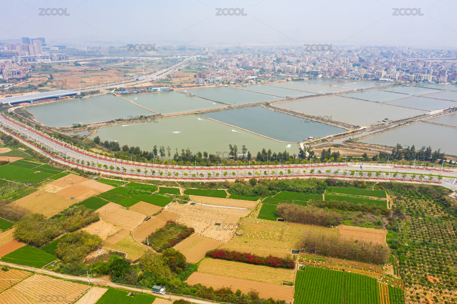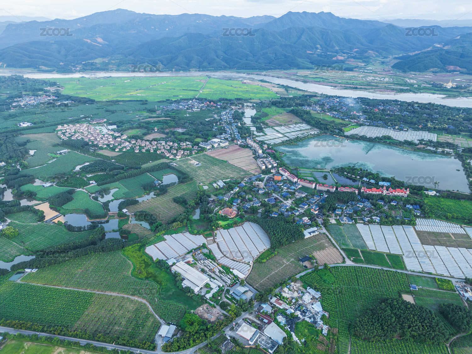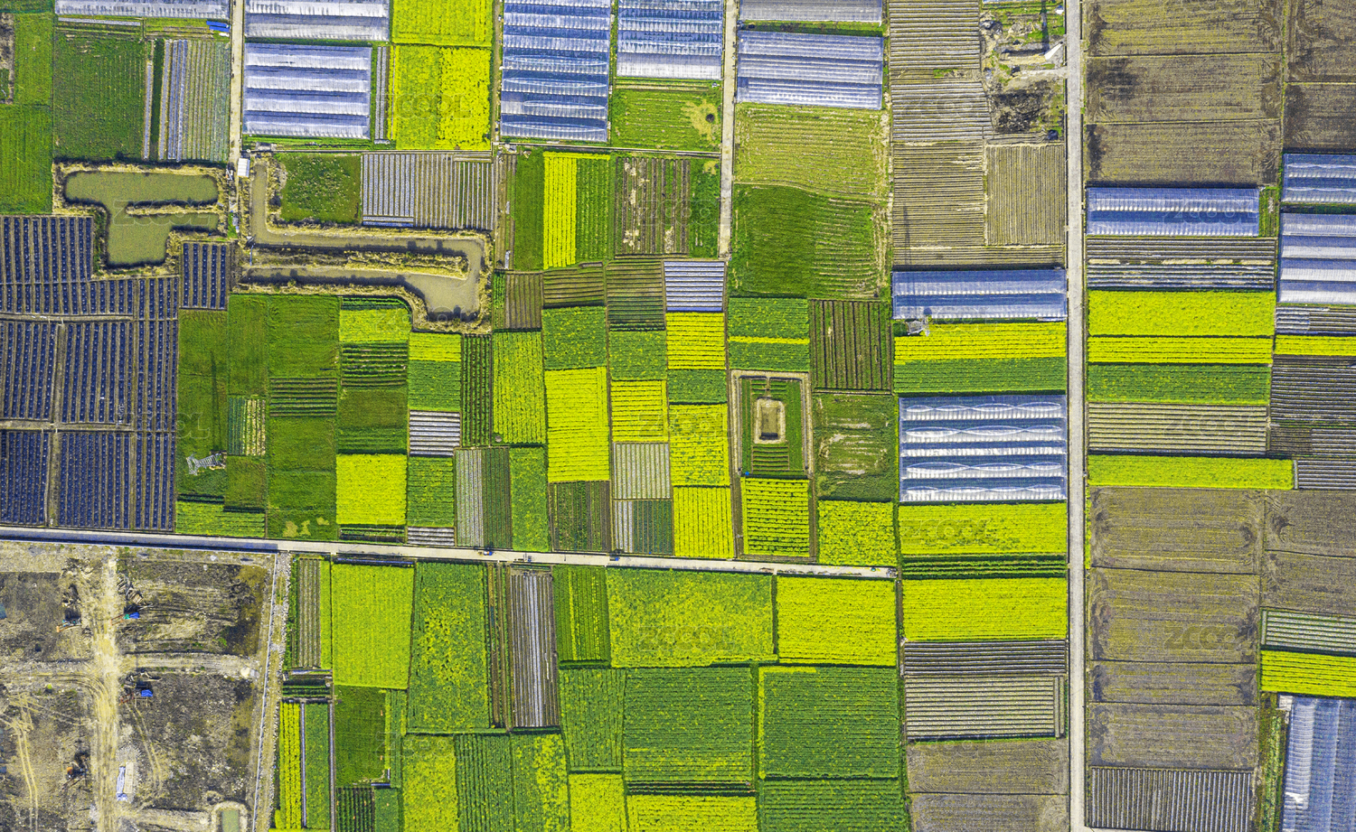 航拍農田與溫室大棚交織的鄉(xiāng)村風光