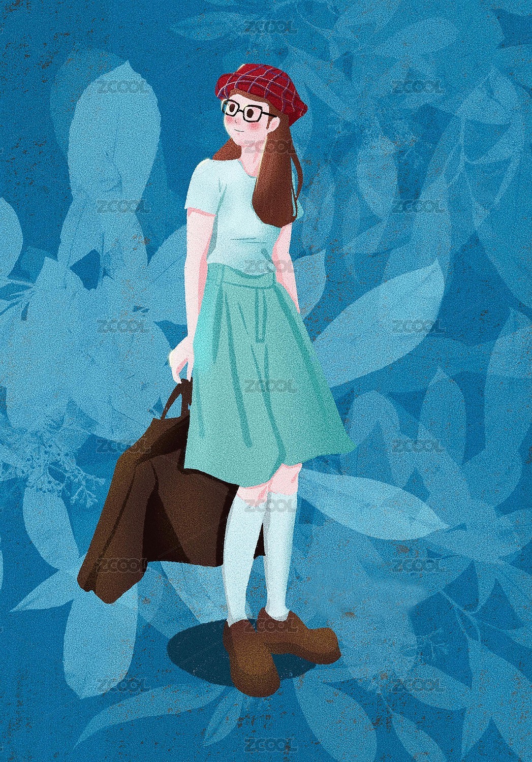 棕色長發(fā)女孩拿著行李