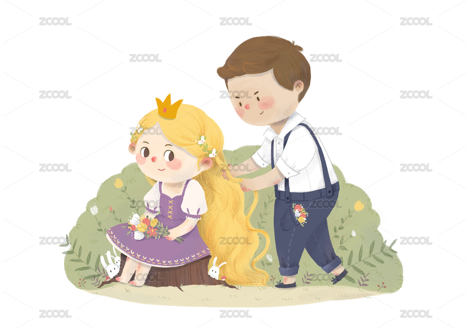 可愛的棕色頭發(fā)男孩給金色的長發(fā)公主編頭發(fā)