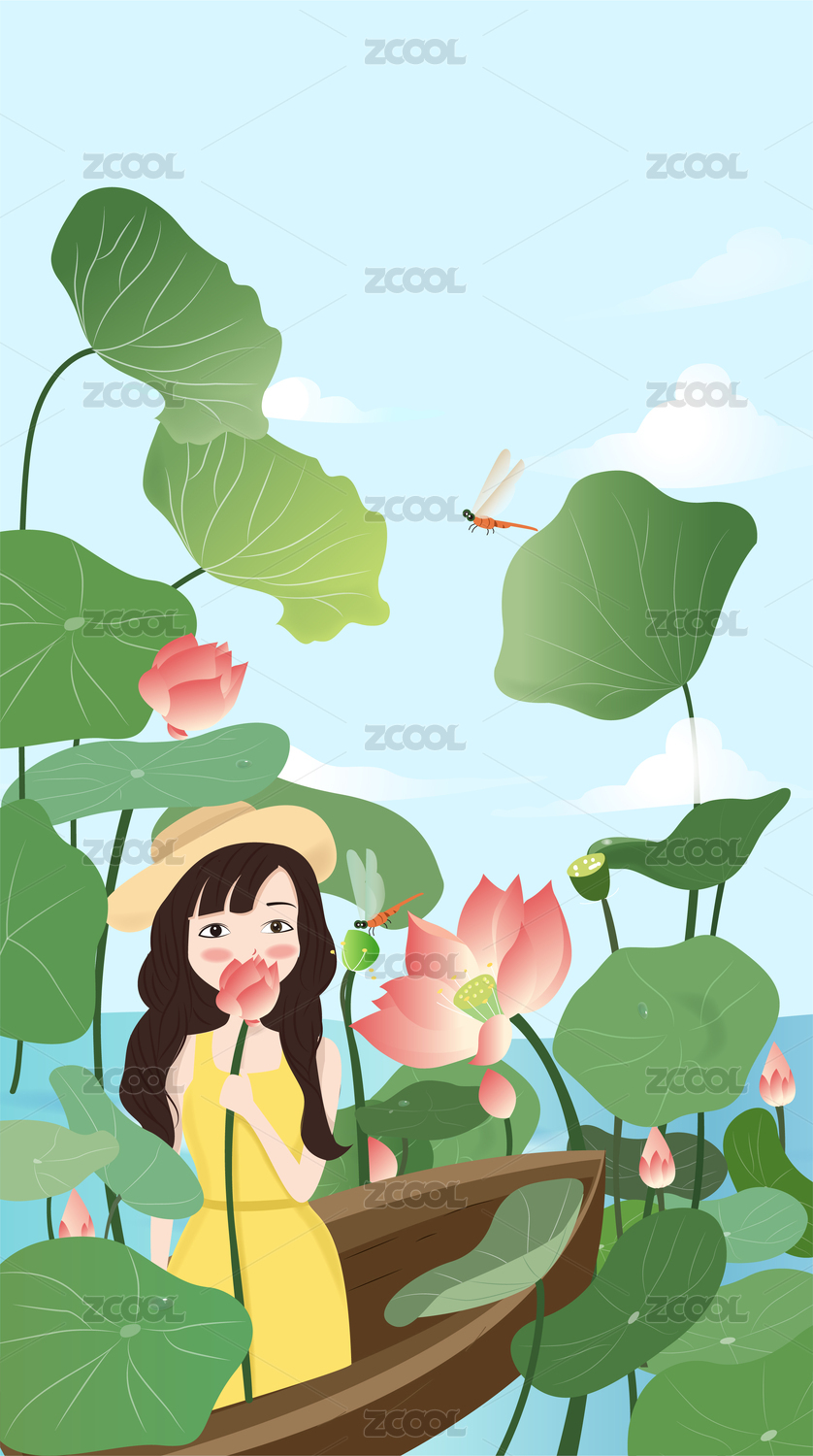 荷塘里在船上拿著荷花著黃裙戴帽子的女孩
