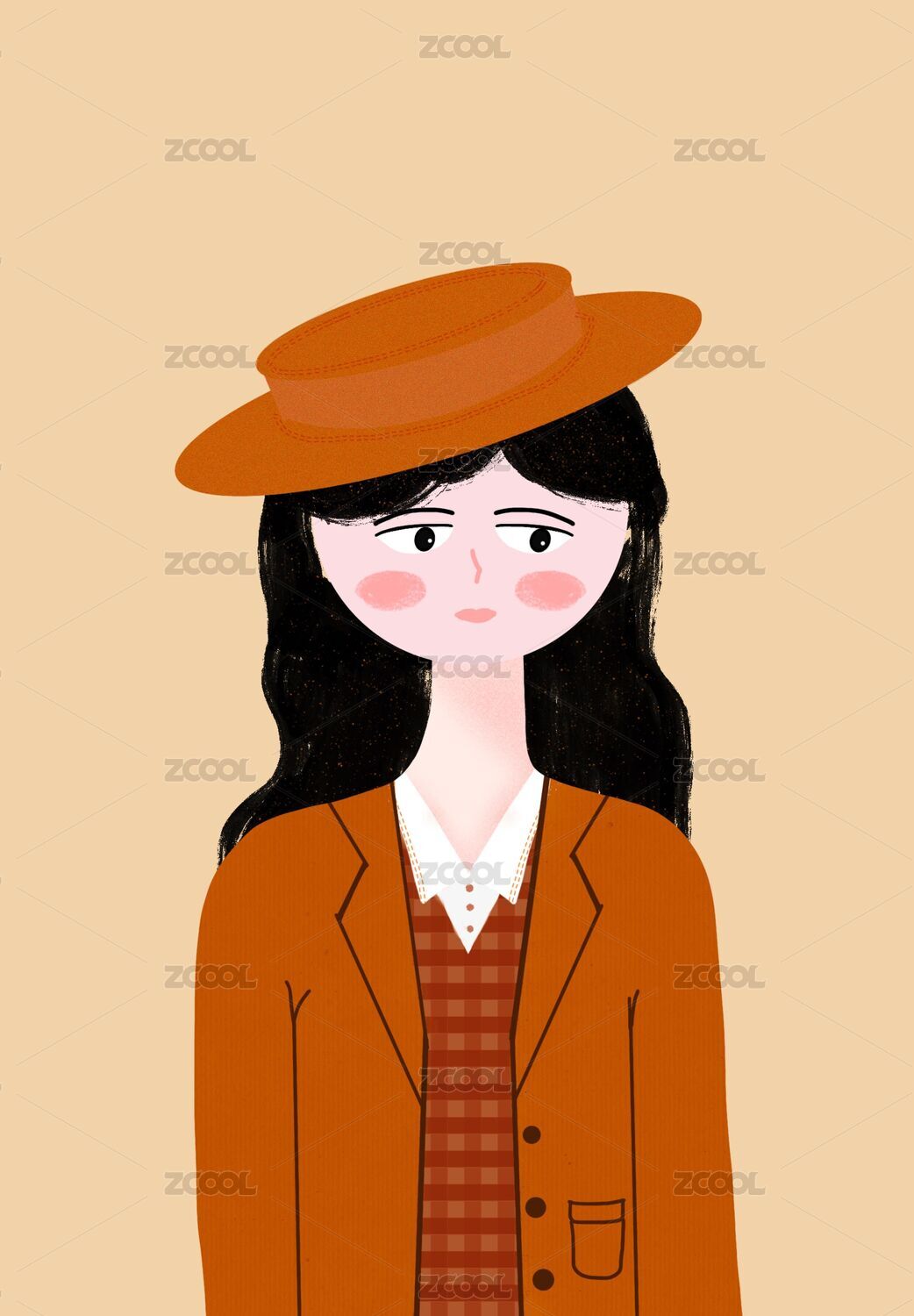 手繪英倫風(fēng)黃棕色格子衫戴帽子女孩頭像手機(jī)