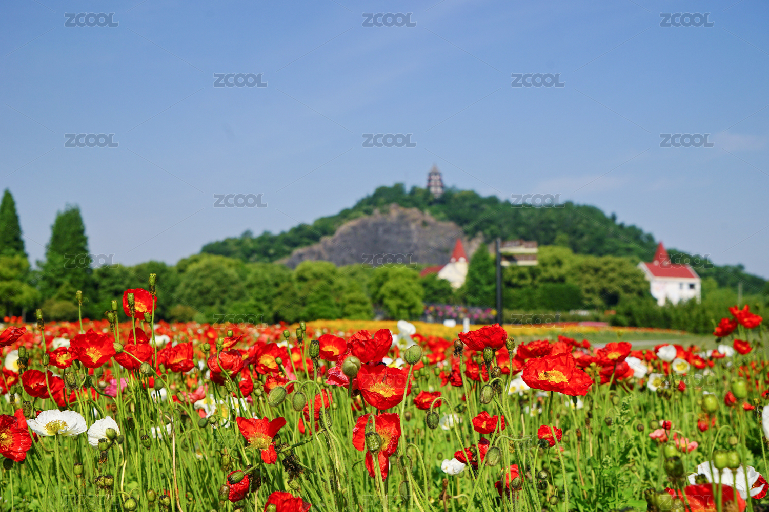 藍(lán)天下虛化的山體背景和紅屋頂前景紅色花海