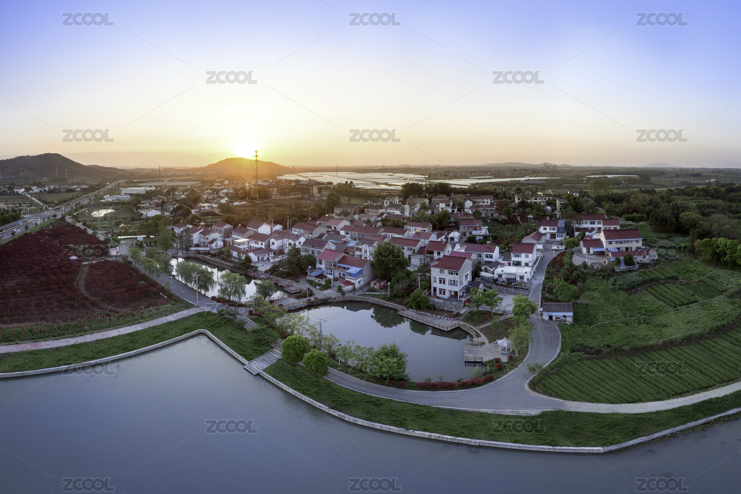 航拍田野藍(lán)天下湖泊邊紅屋頂白墻的新型村莊