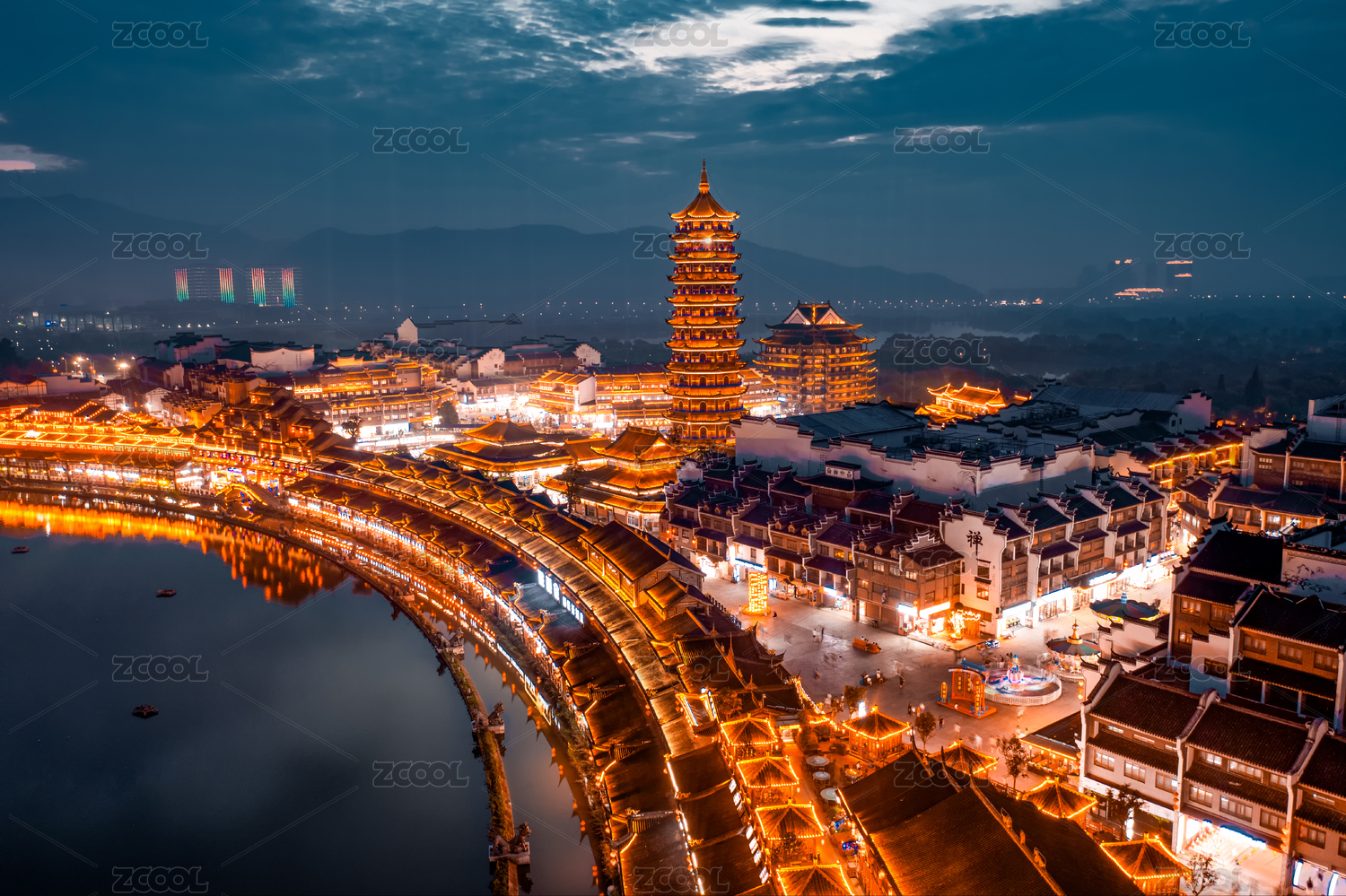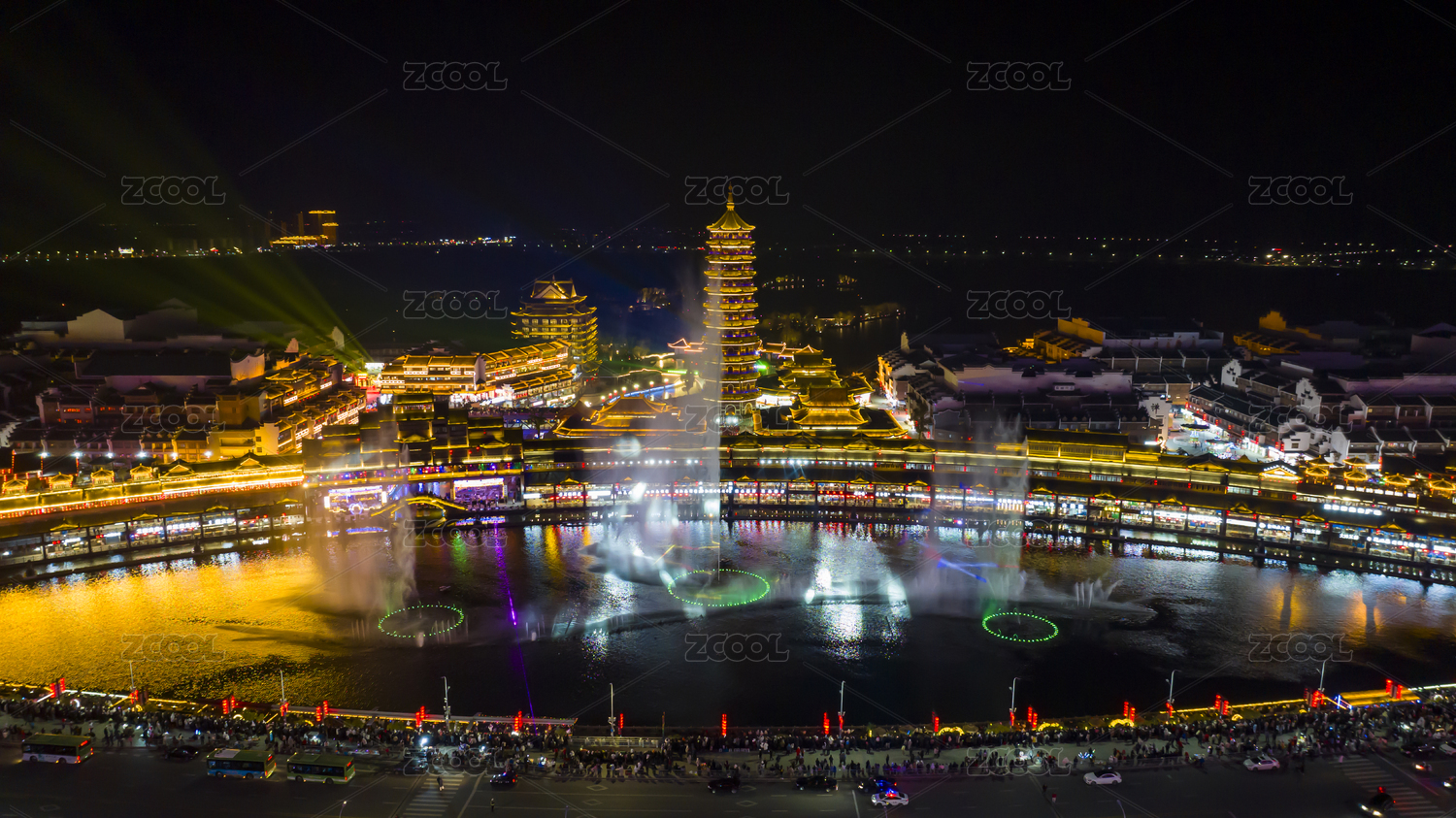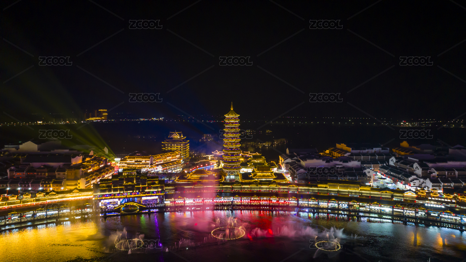 浙江湖州龍之夢(mèng)太湖古鎮(zhèn)夜晚航拍