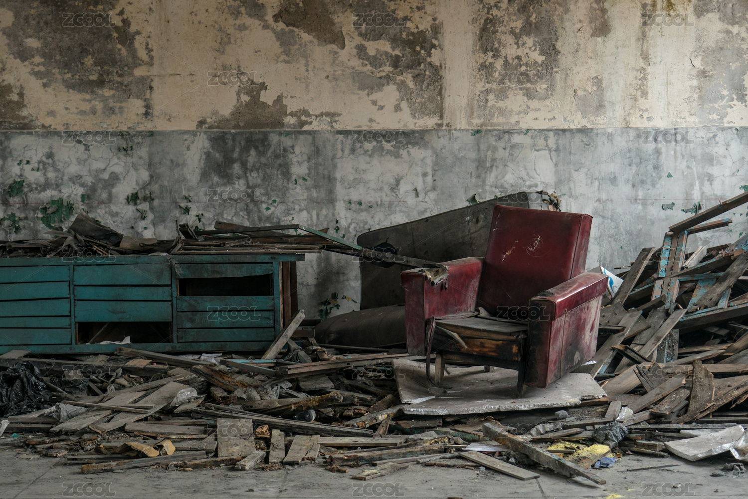 室內廢墟中被損壞的紅色沙發(fā)