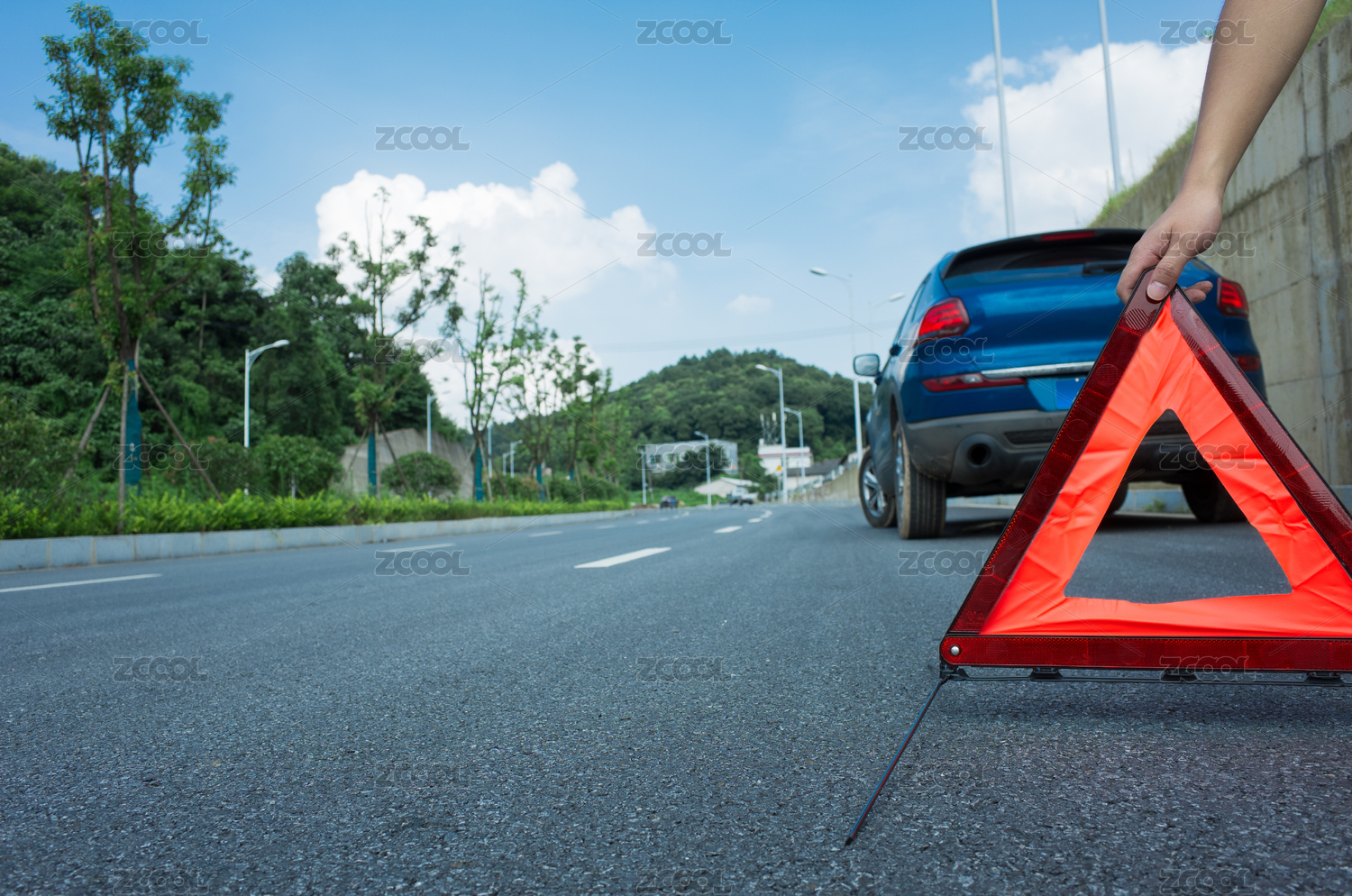 遠處的路邊停著一輛壞掉的汽車,車后面一個人正在放置三角警告牌