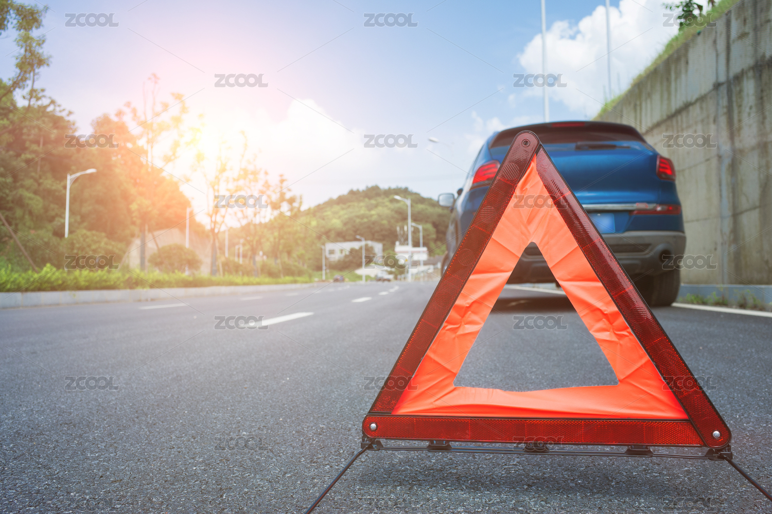 遠處的路邊停著一輛壞掉的汽車,車后面放著一個三角警告牌