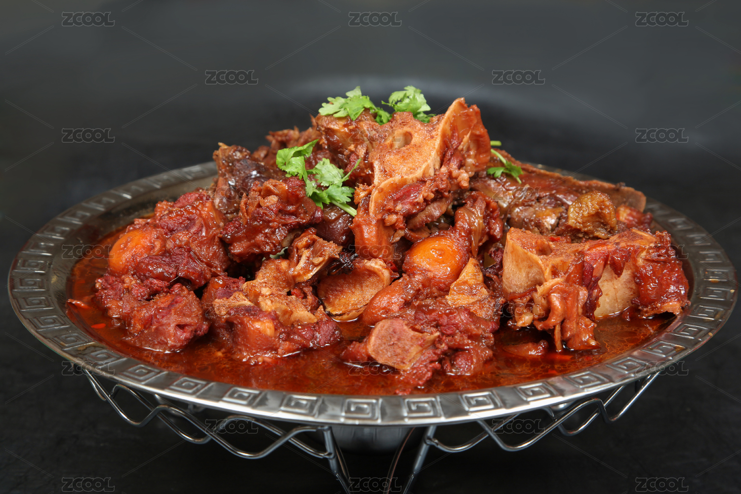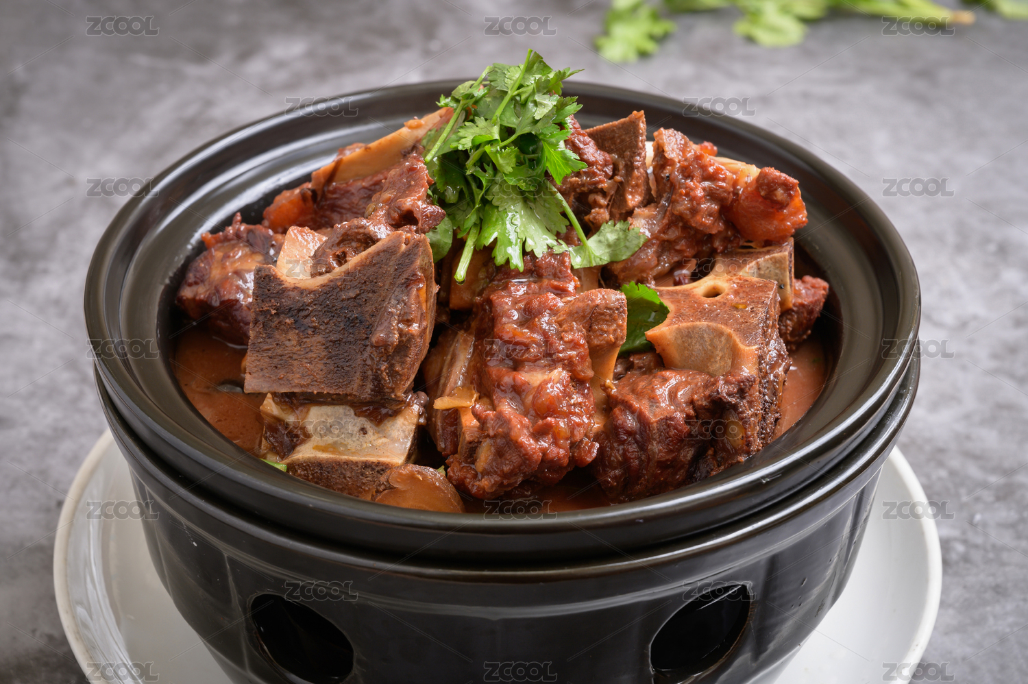 褐色砂鍋裝的香燜牛仔骨擺放在黑色鵝卵石上