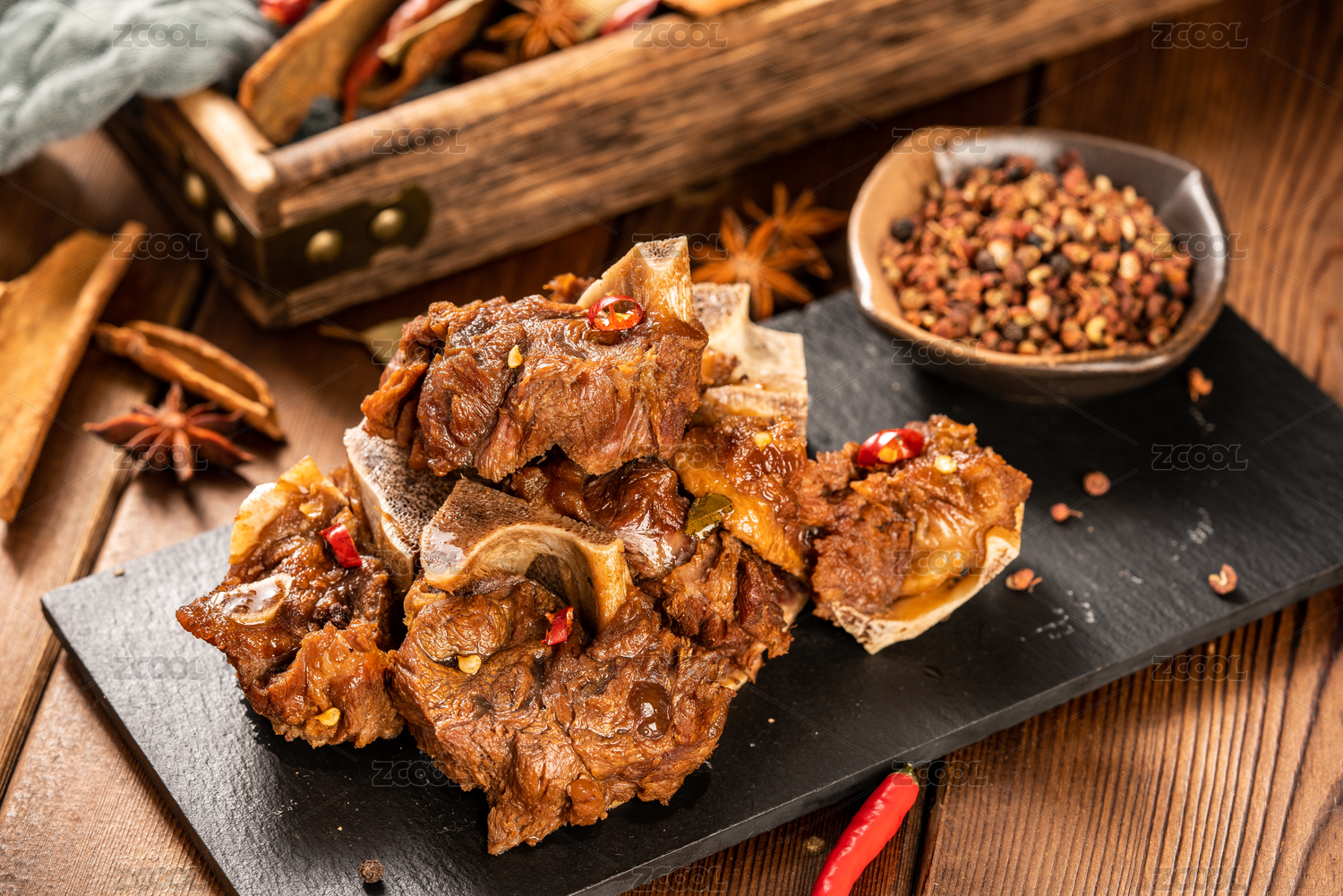 木板背景上的醬牛肉骨
