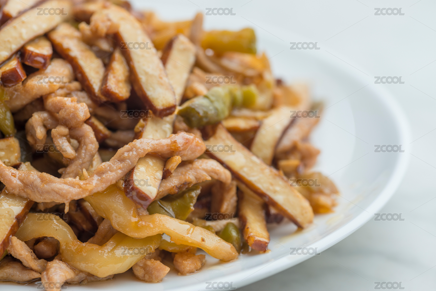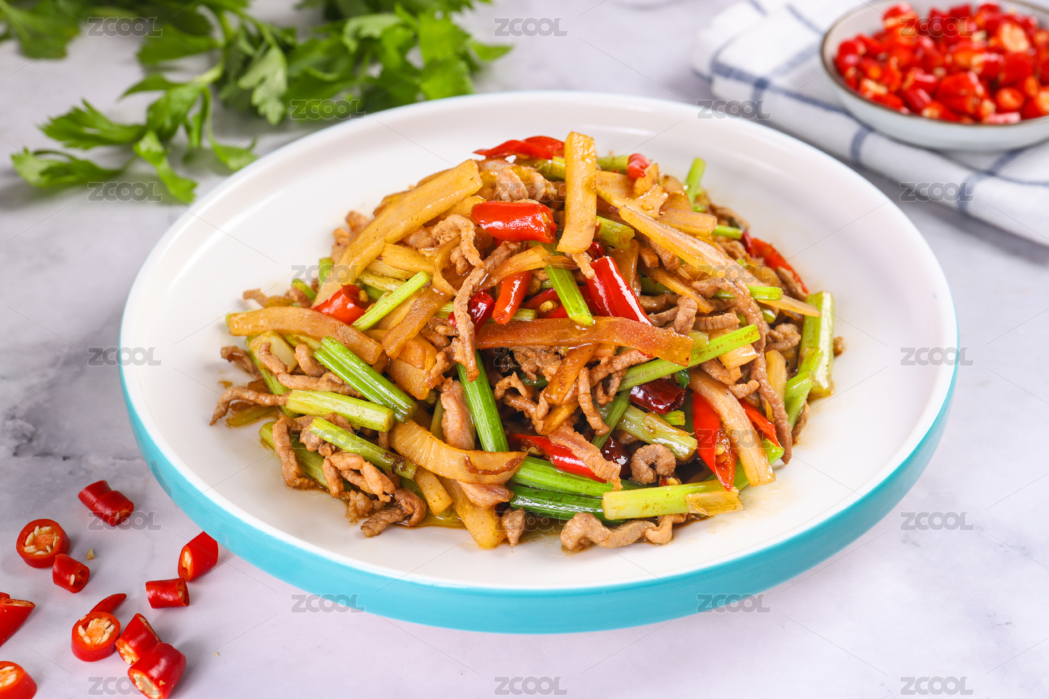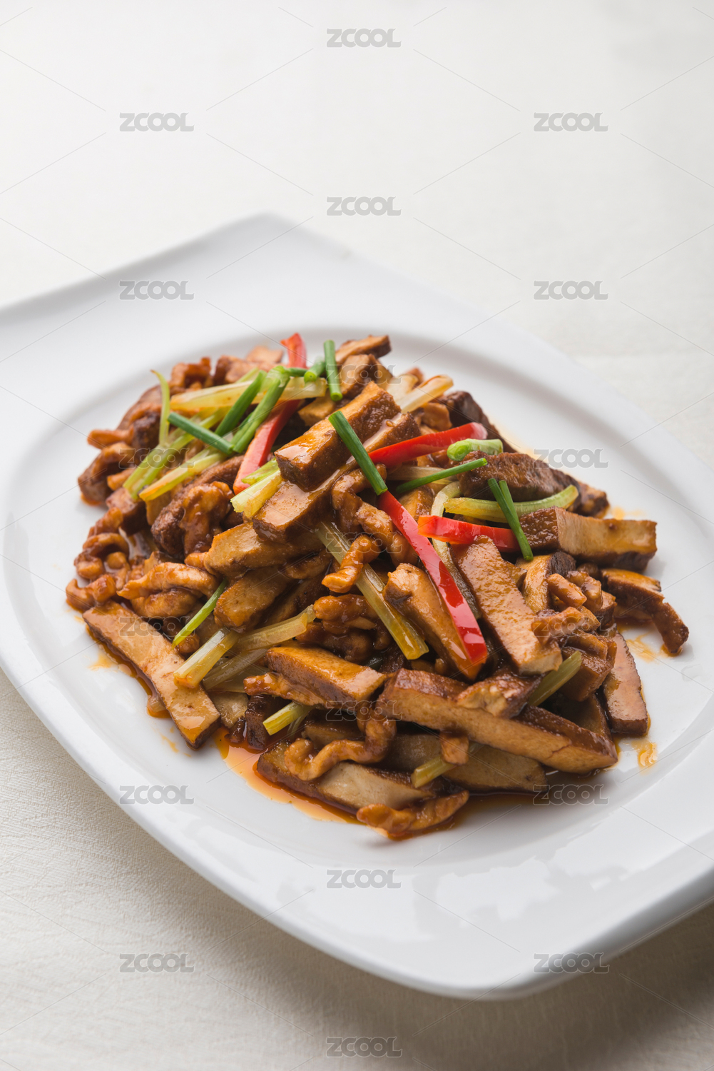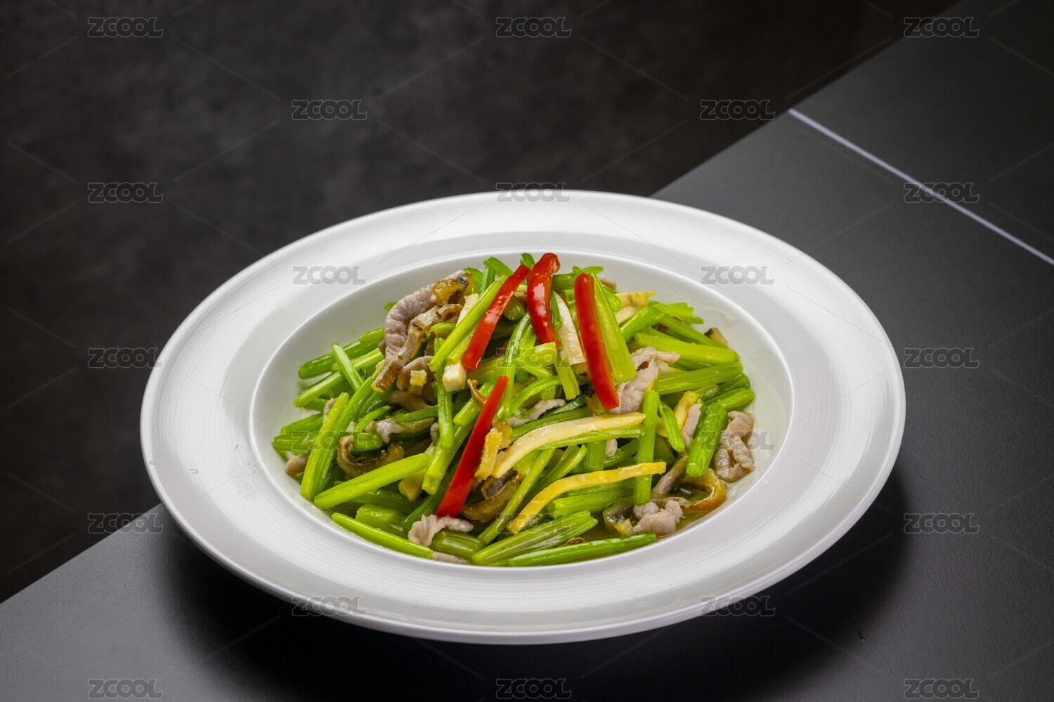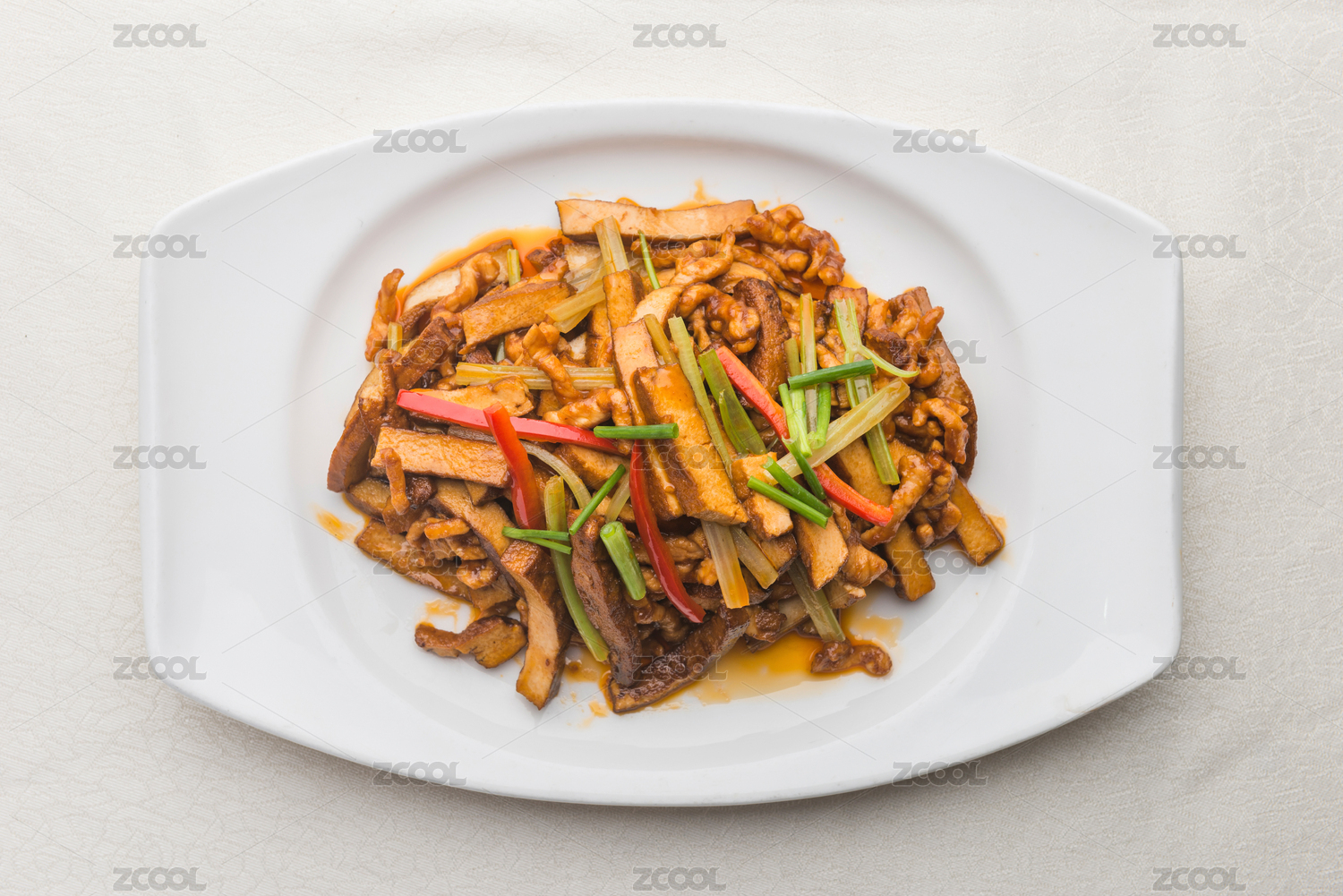 白瓷盤里美味可口的芹菜香干炒肉絲