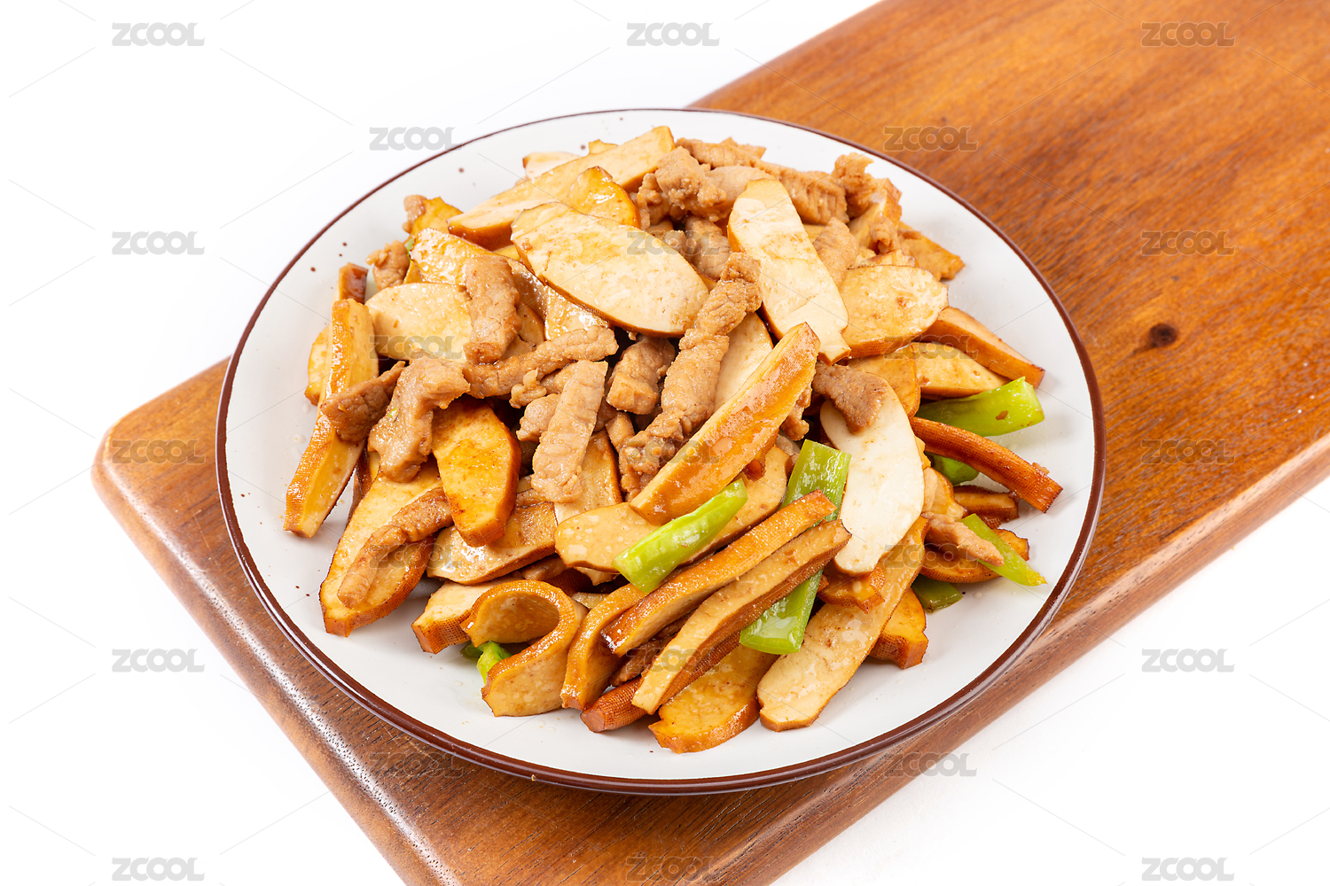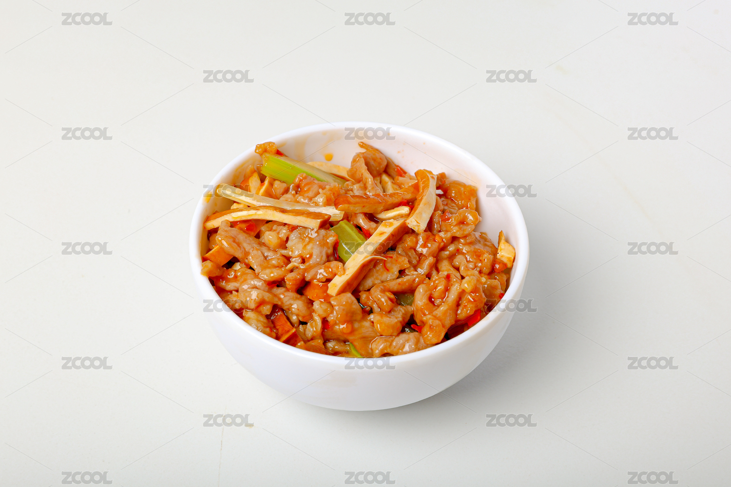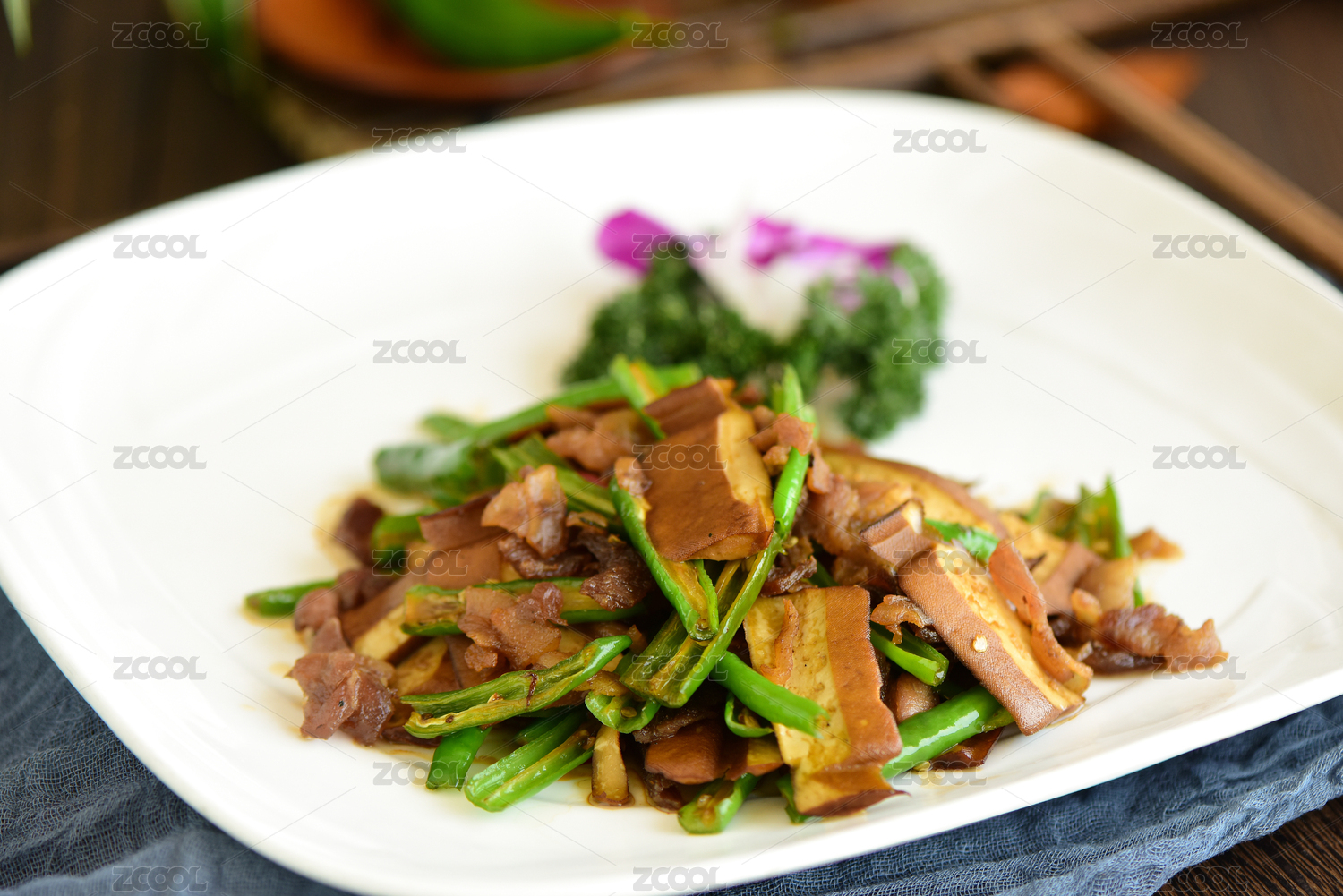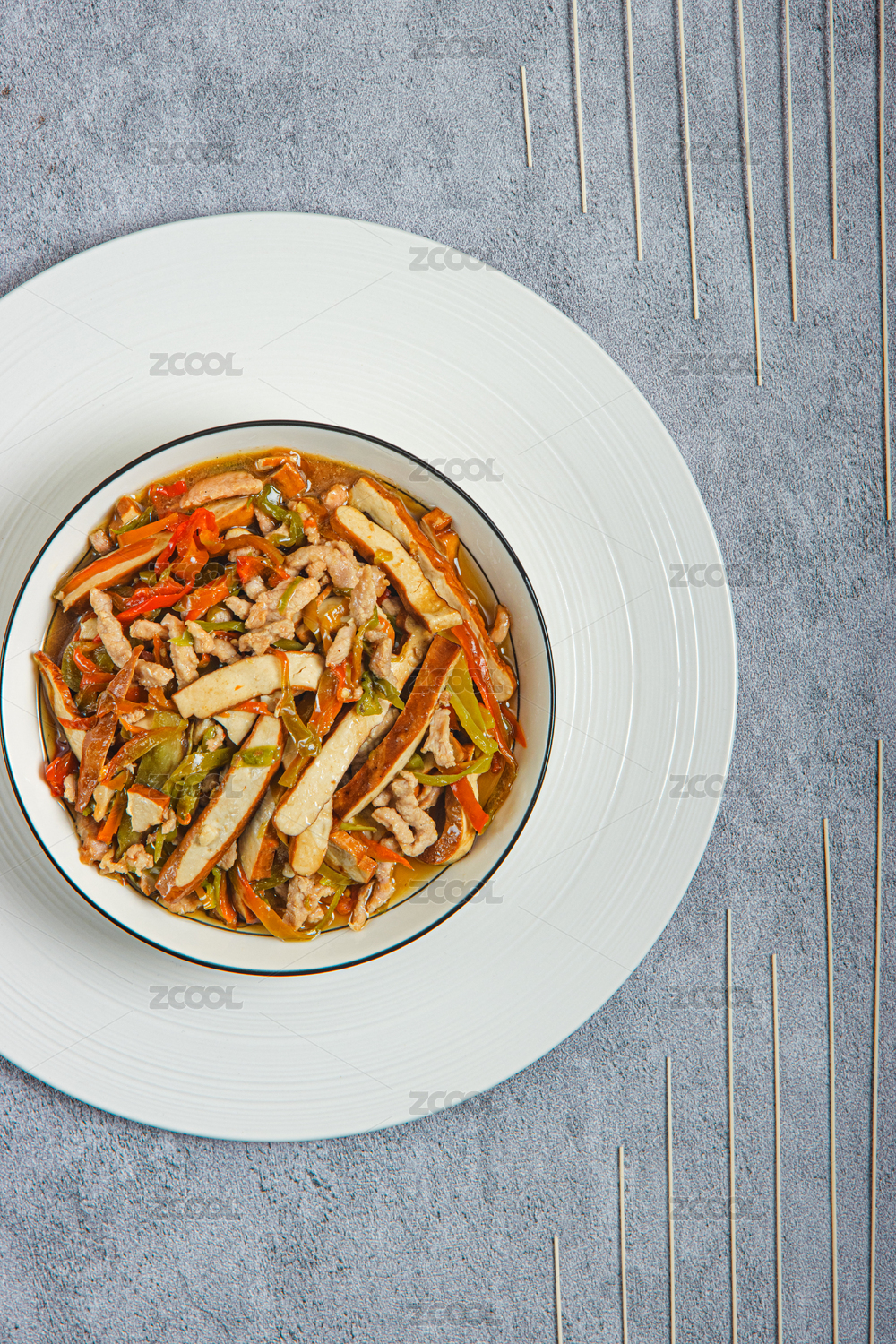 白瓷盤里美味可口的芹菜香干炒肉絲