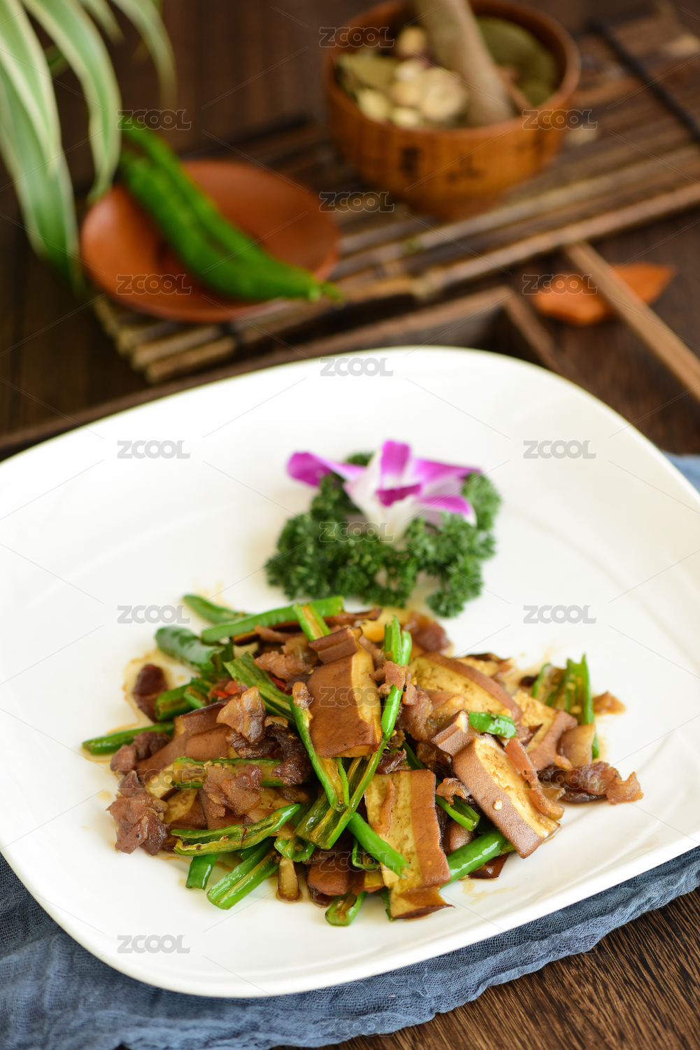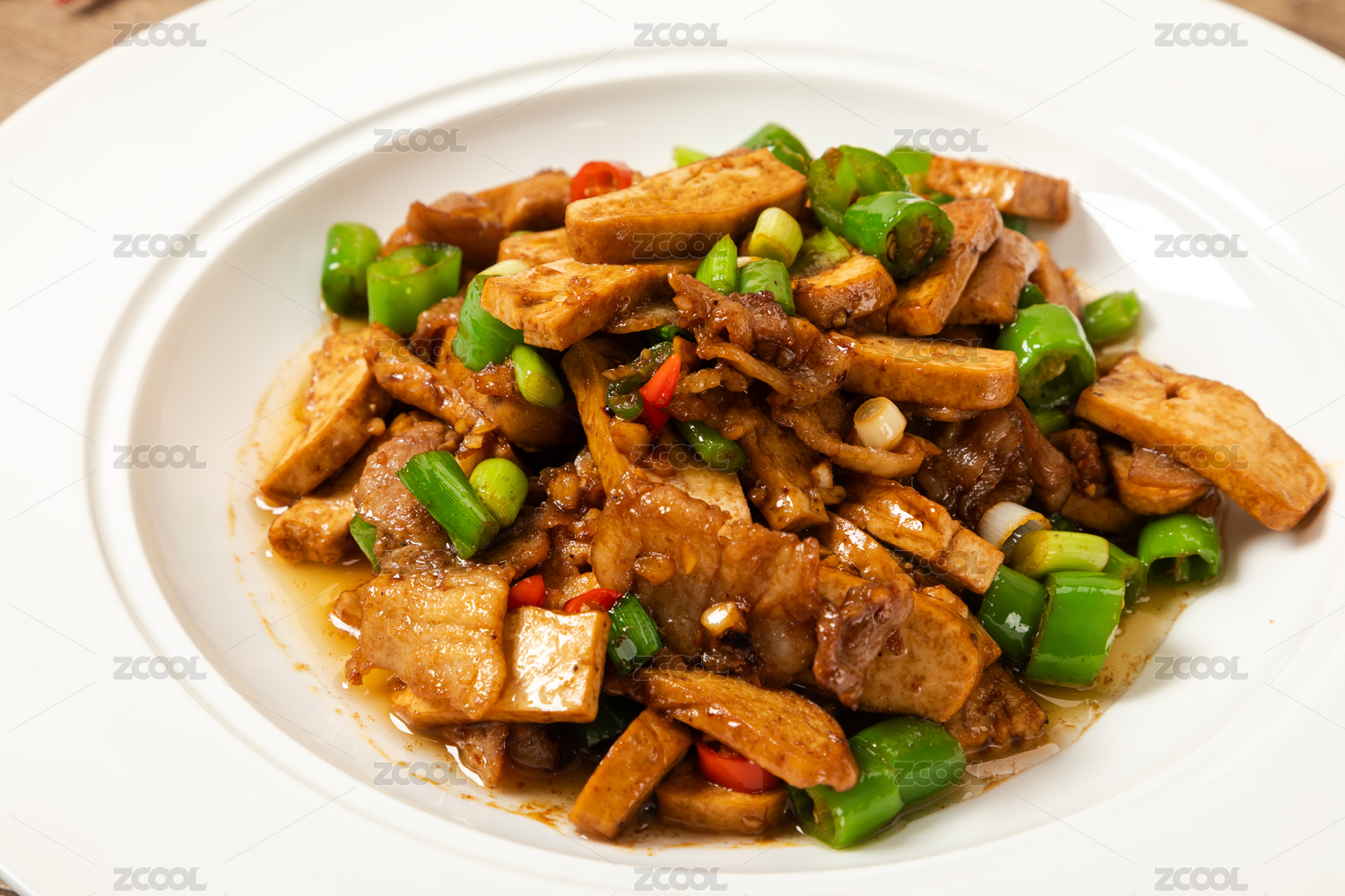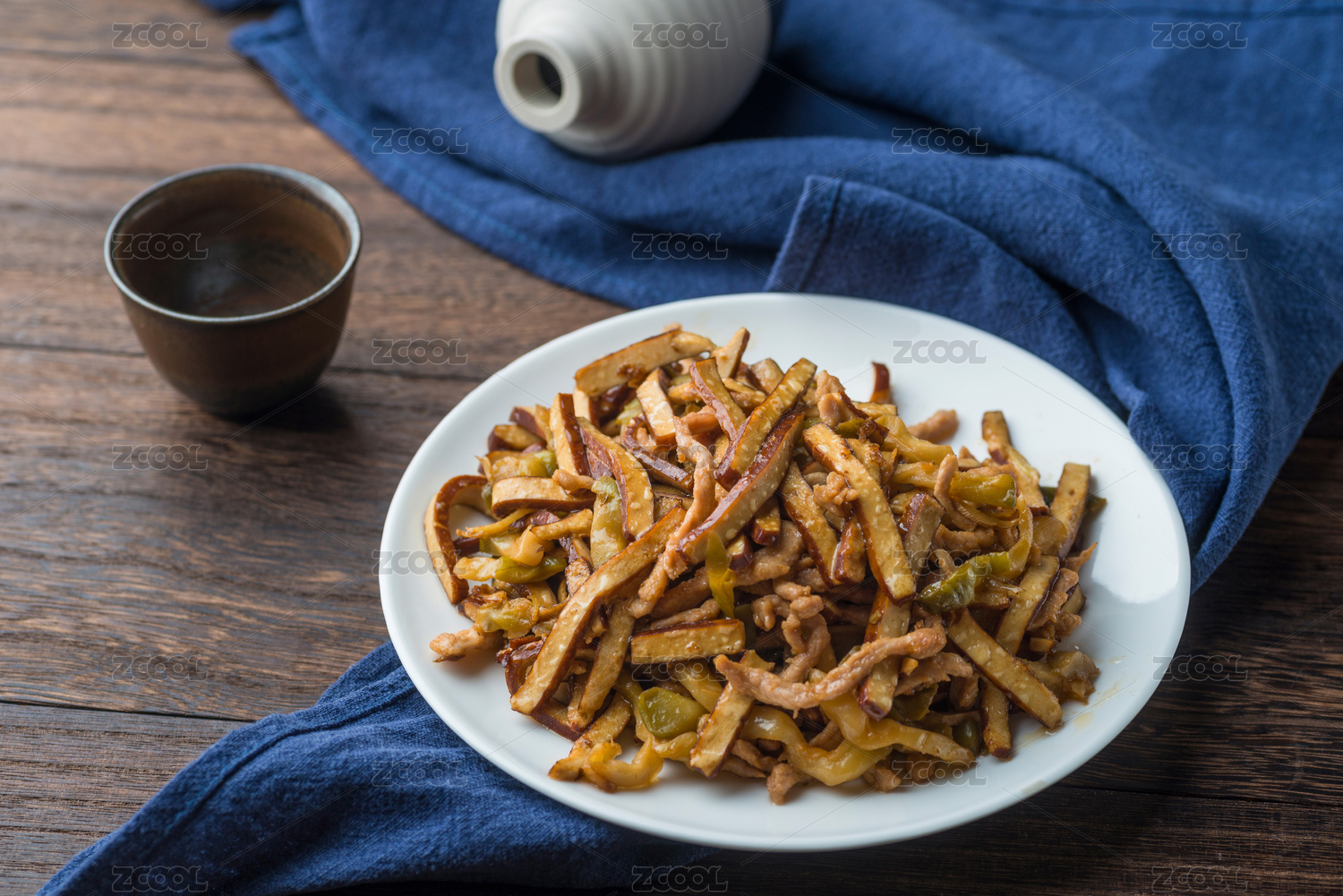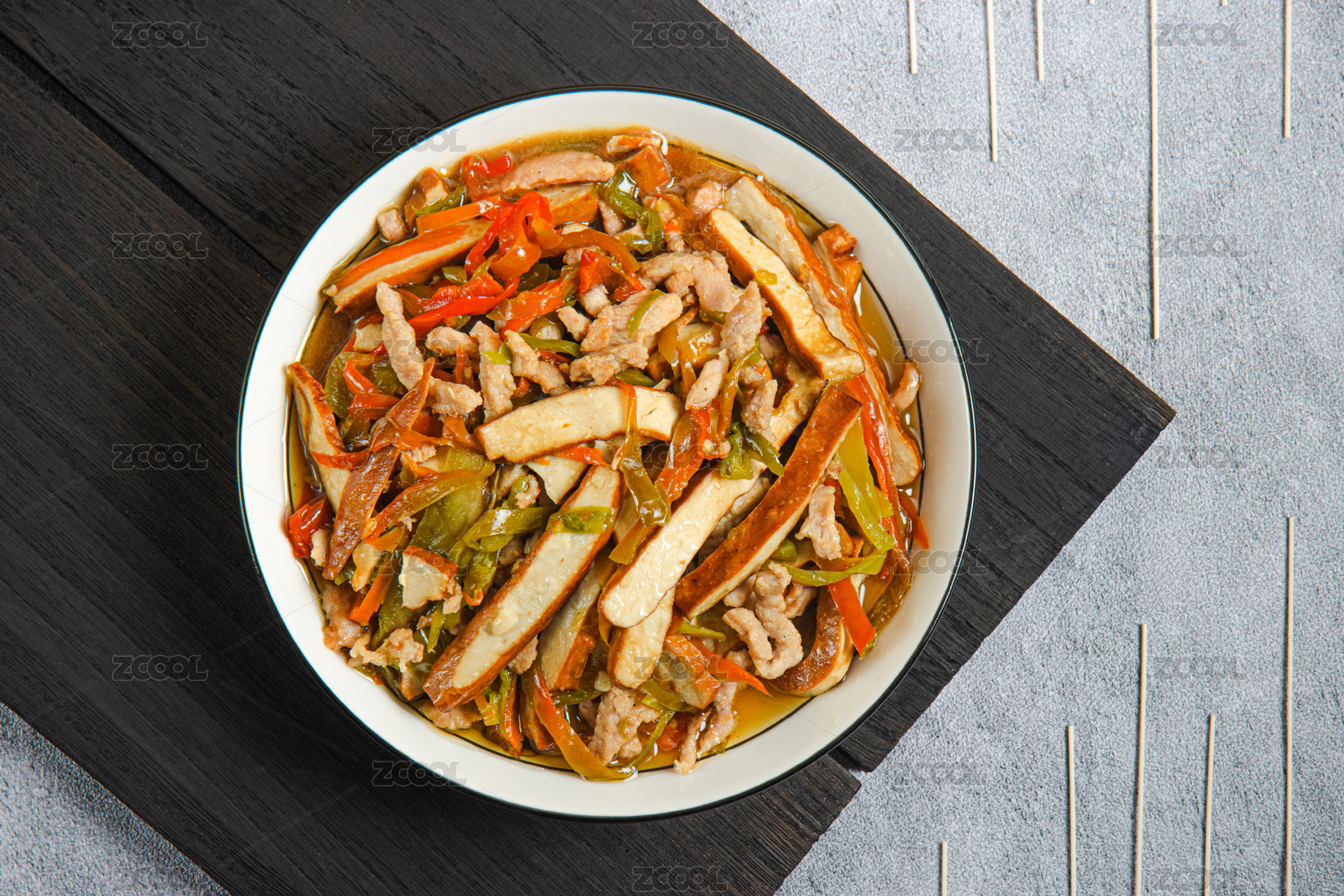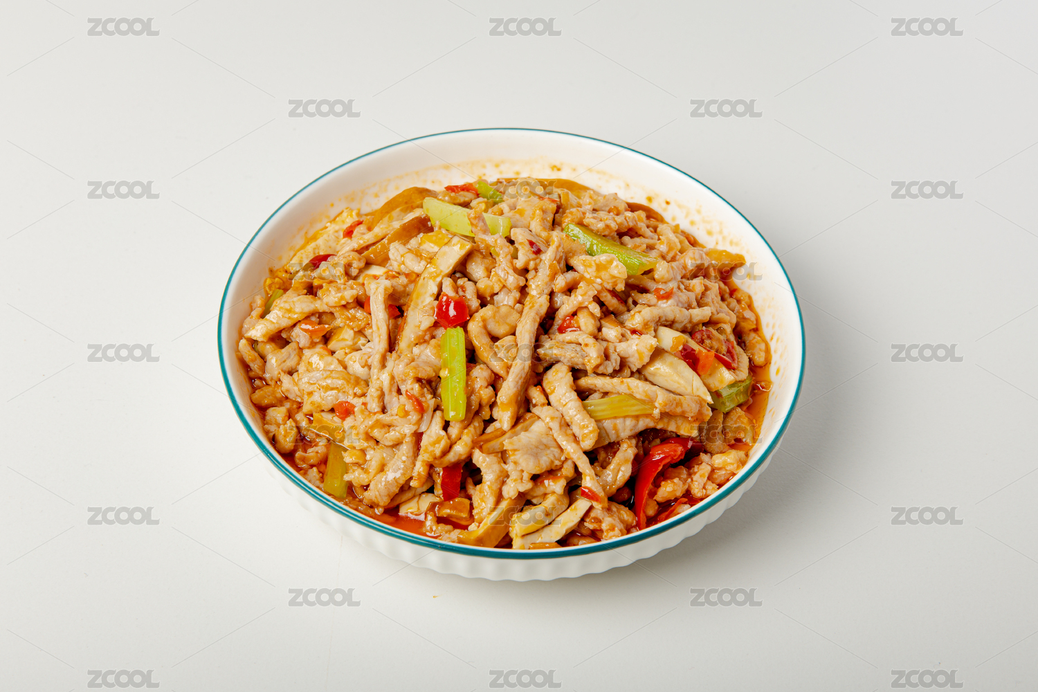 白瓷盤里美味可口的芹菜香干炒肉絲