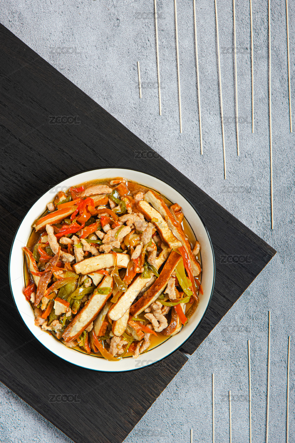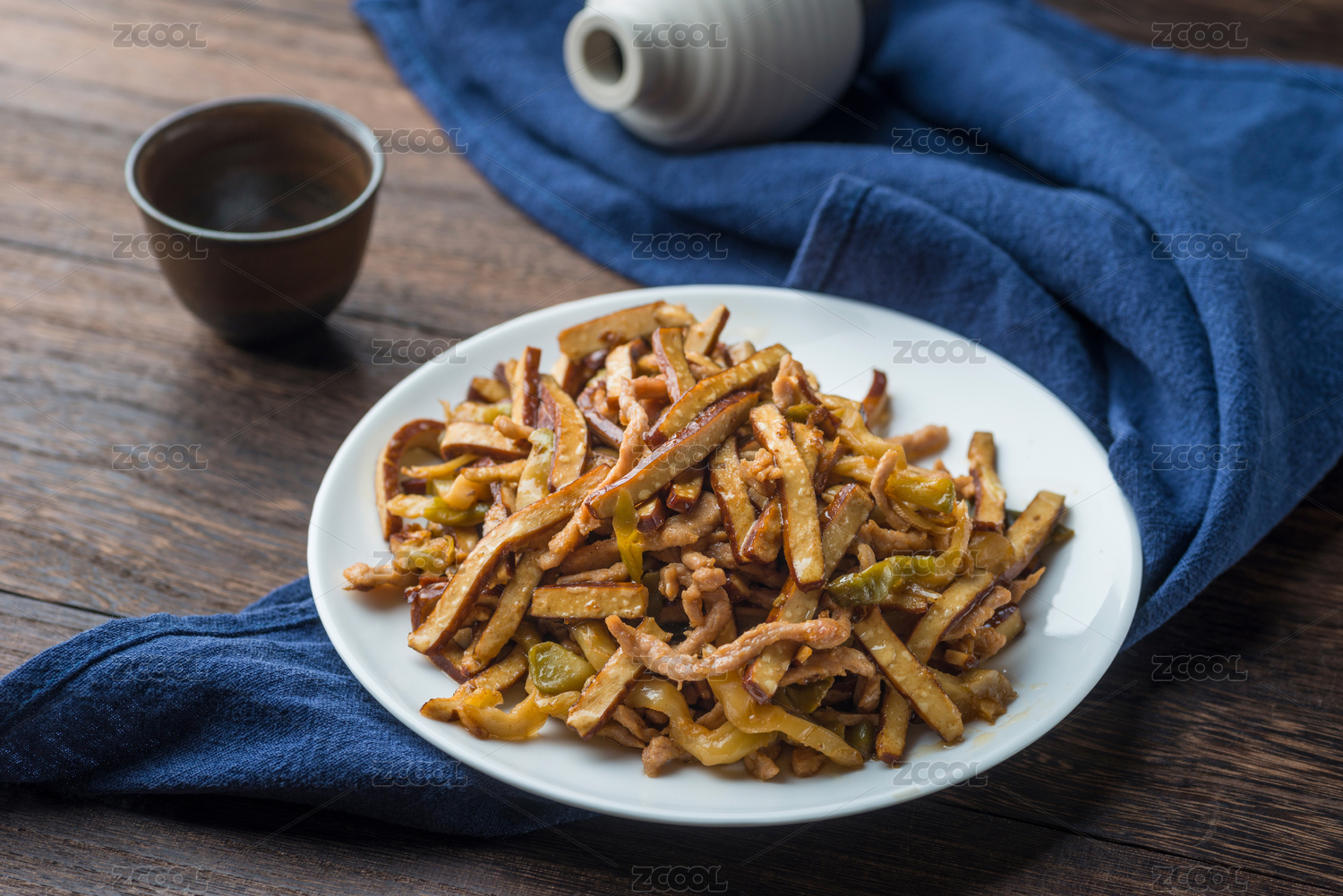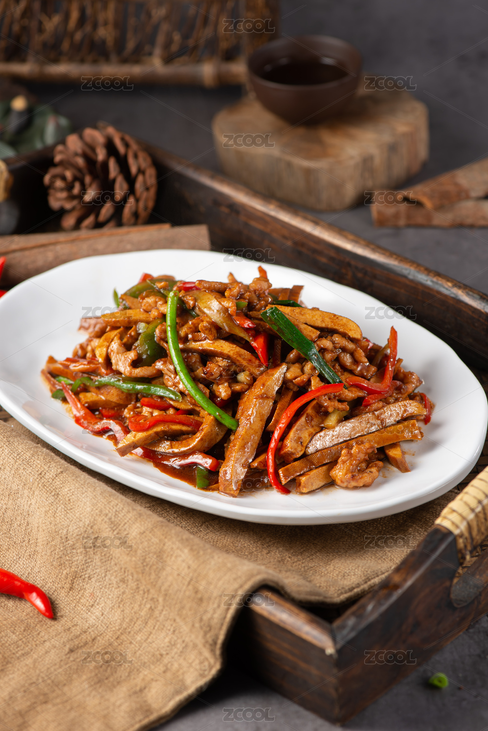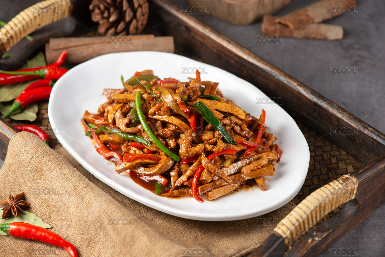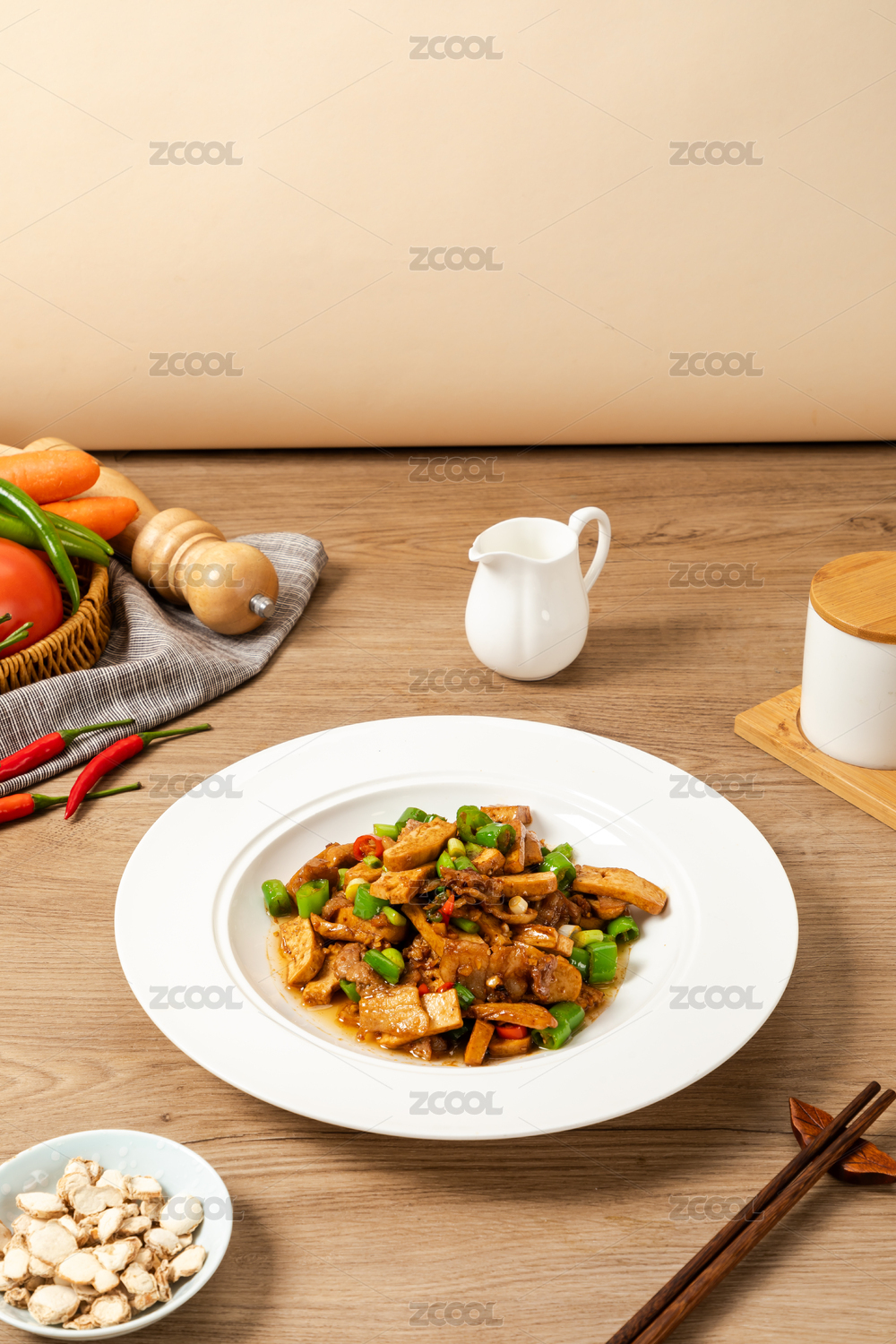 白瓷盤里美味可口的芹菜香干炒肉絲