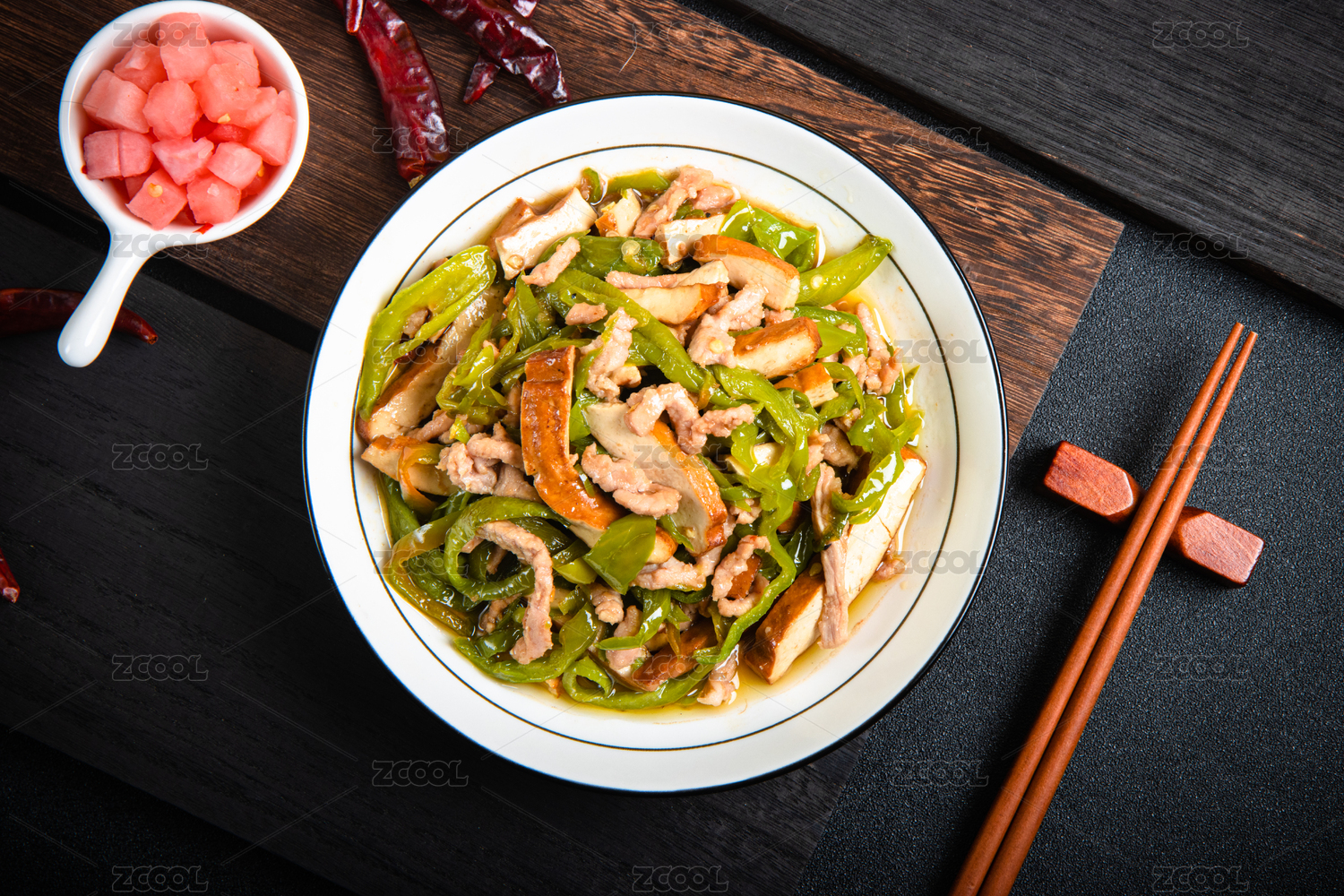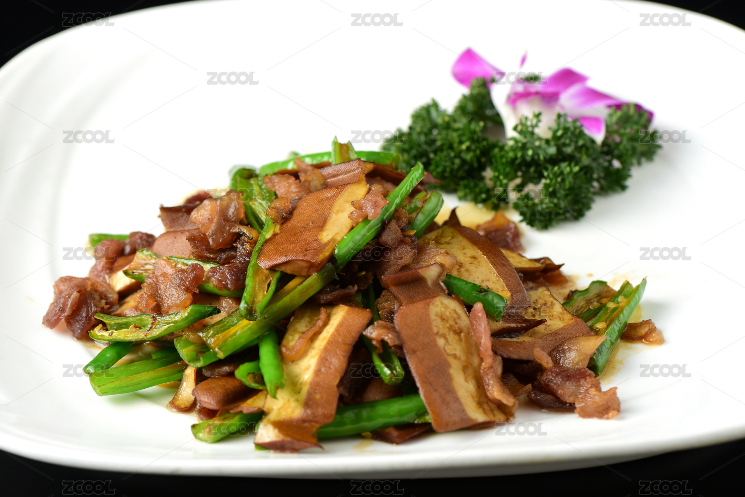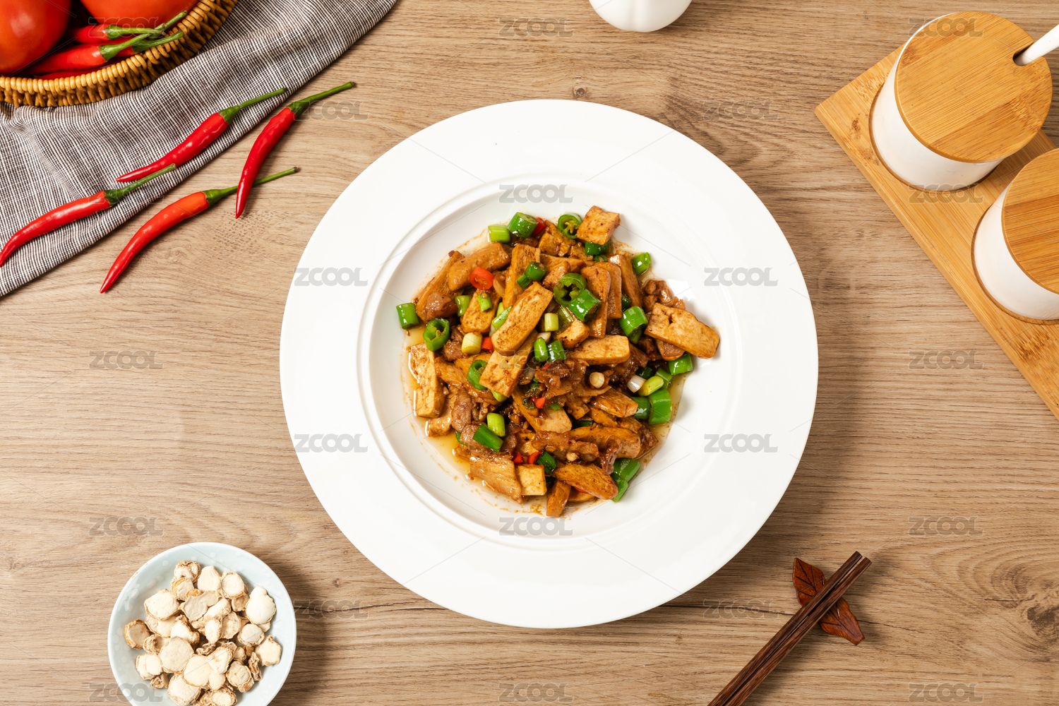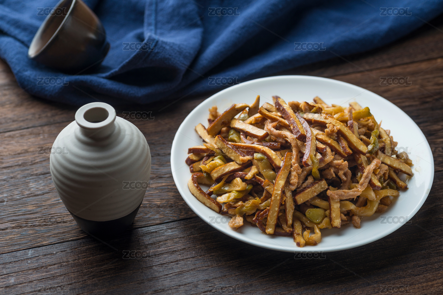 白瓷盤里美味可口的芹菜香干炒肉絲