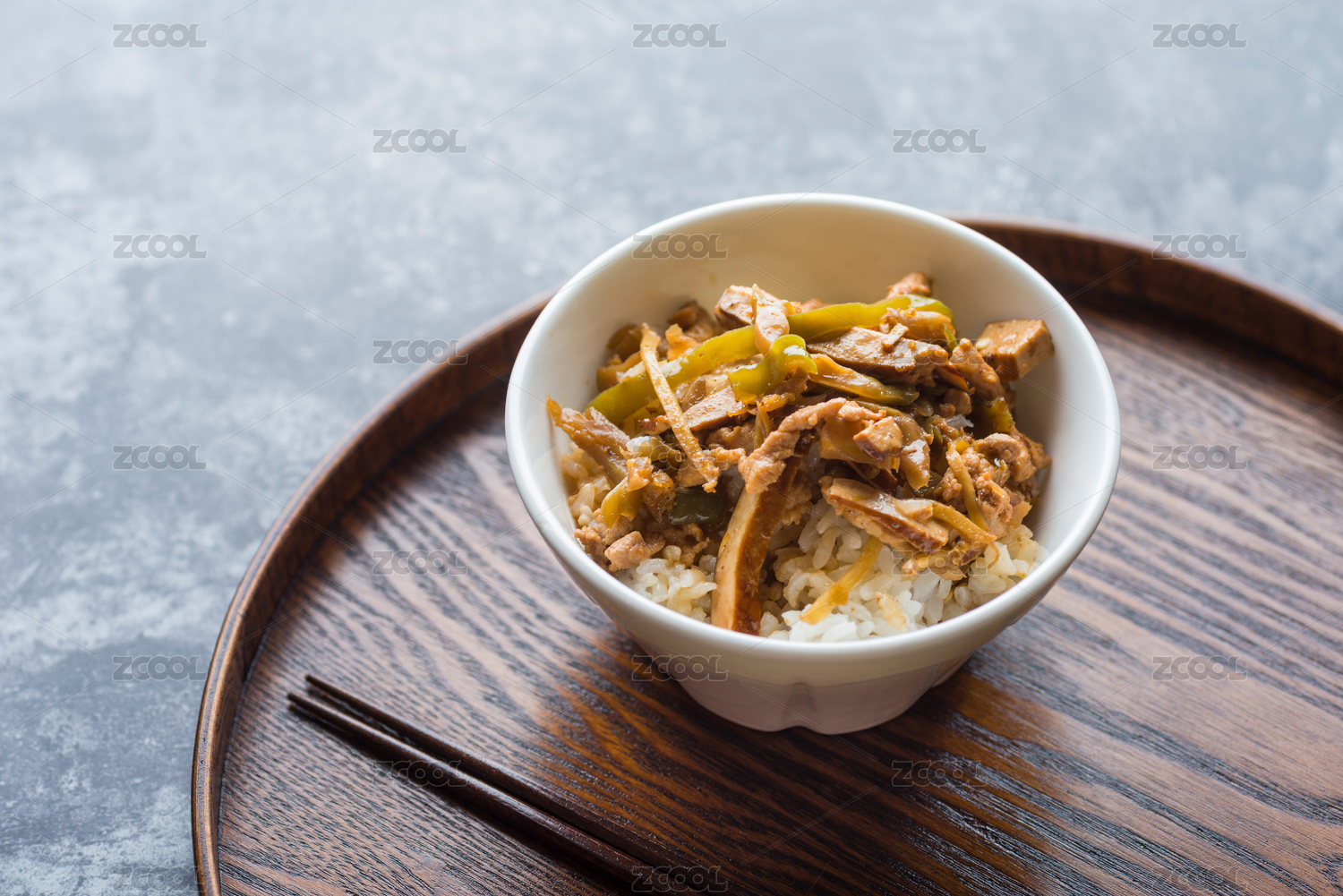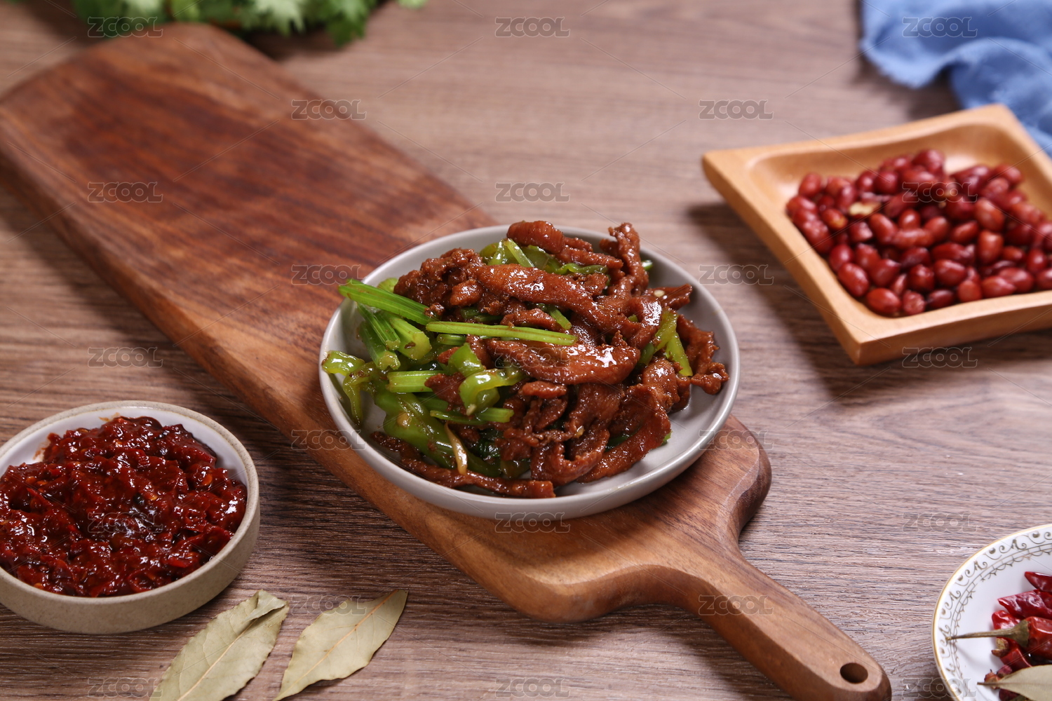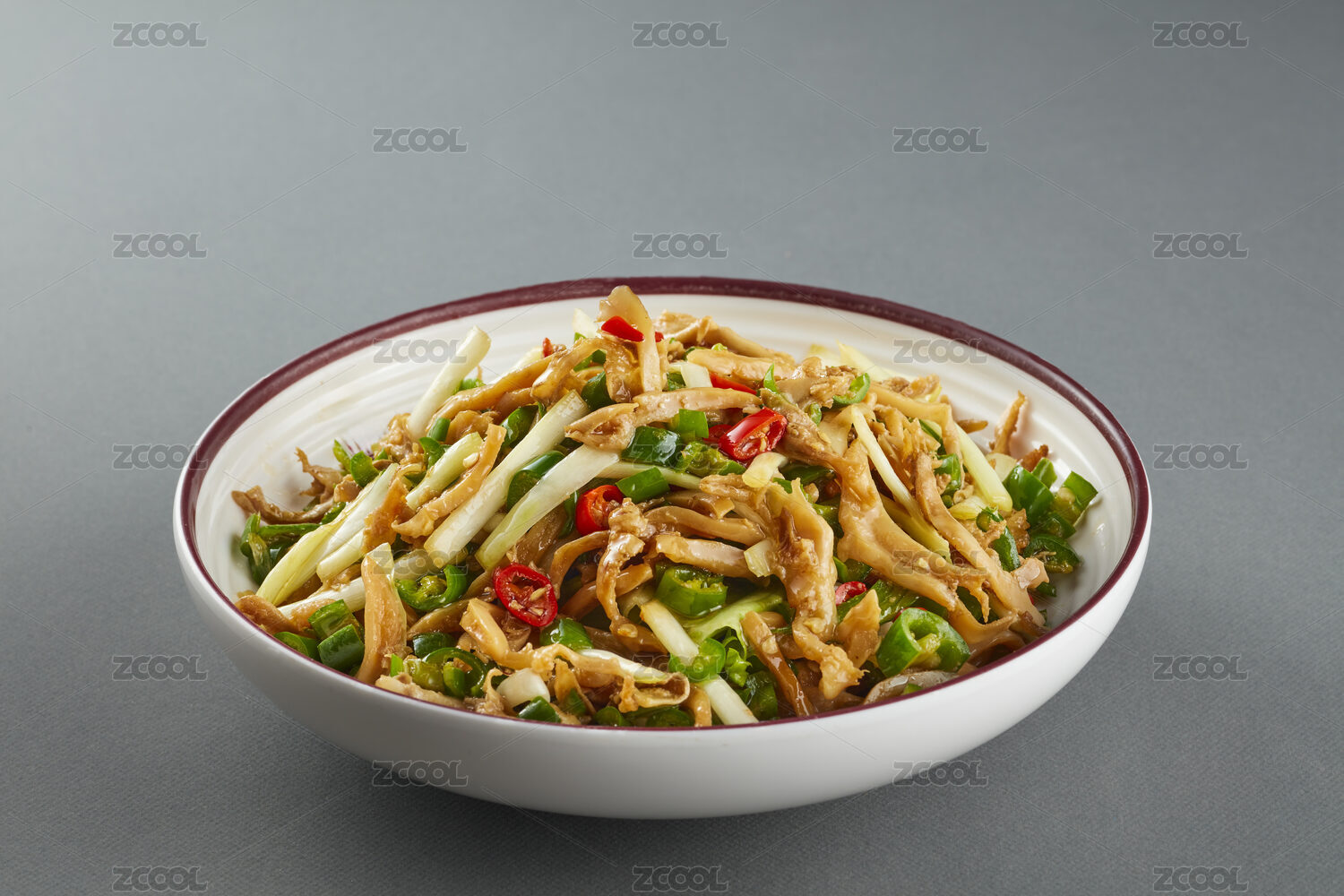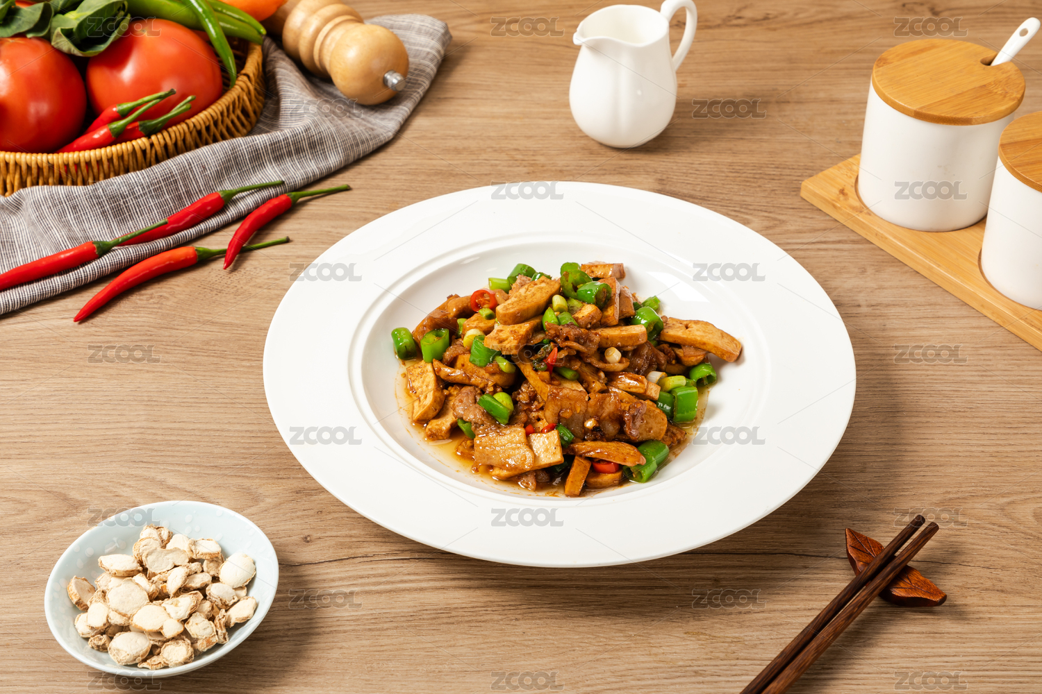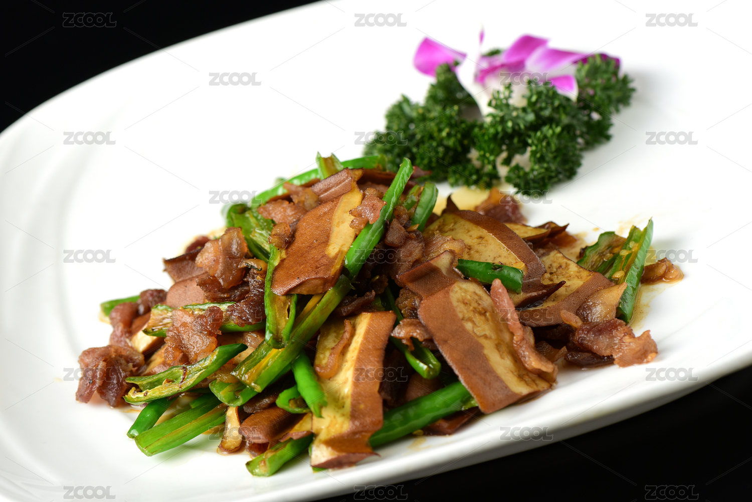 白瓷盤里美味可口的芹菜香干炒肉絲