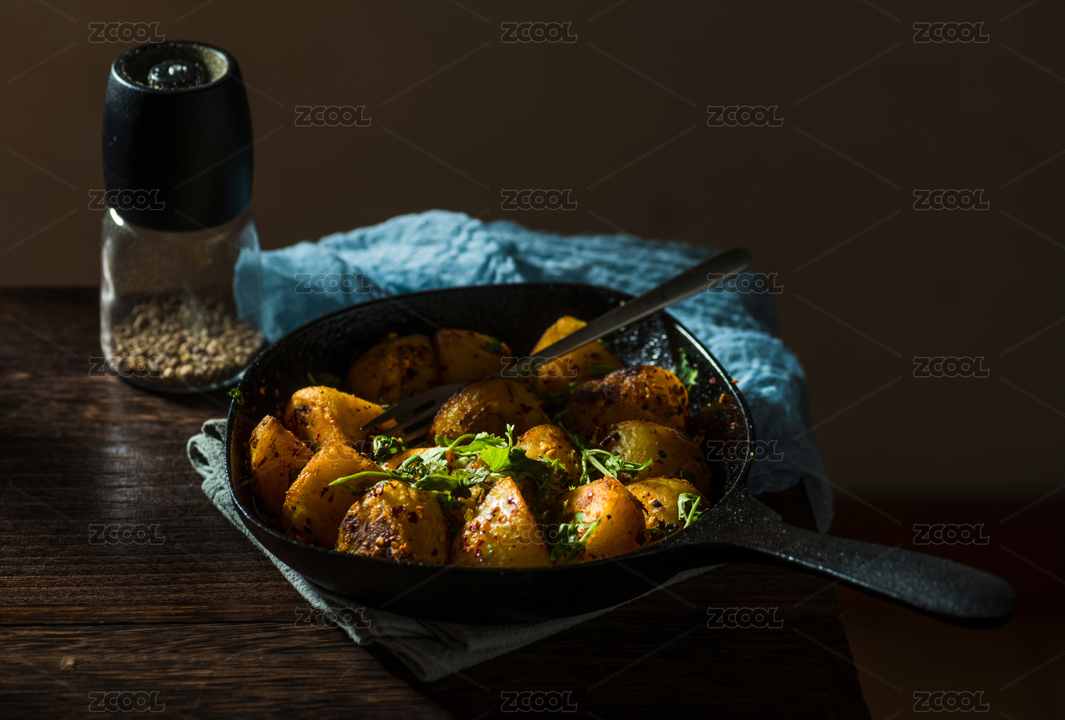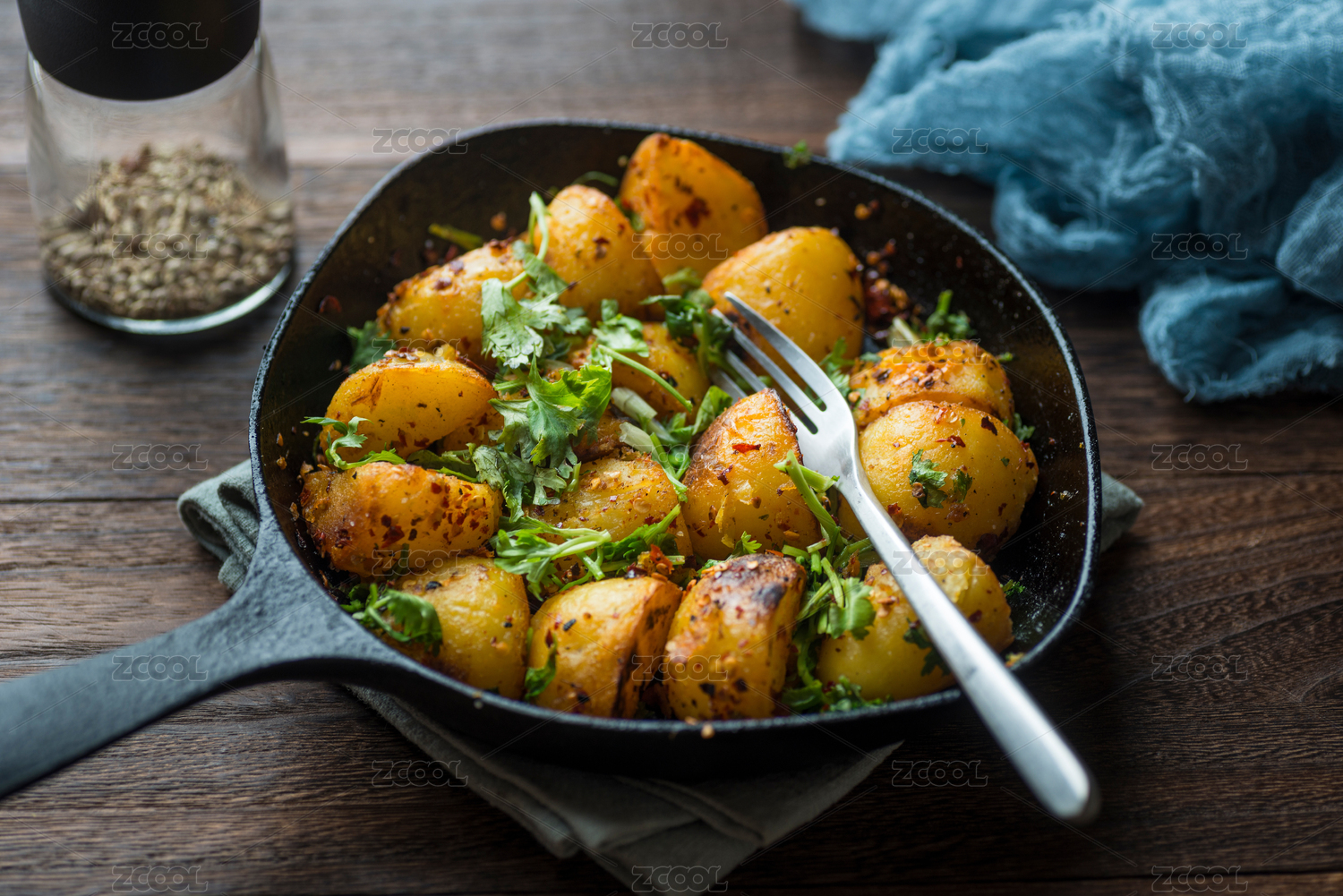 鑄鐵煎鍋里覆蓋有香菜和辣椒碎的炕土豆