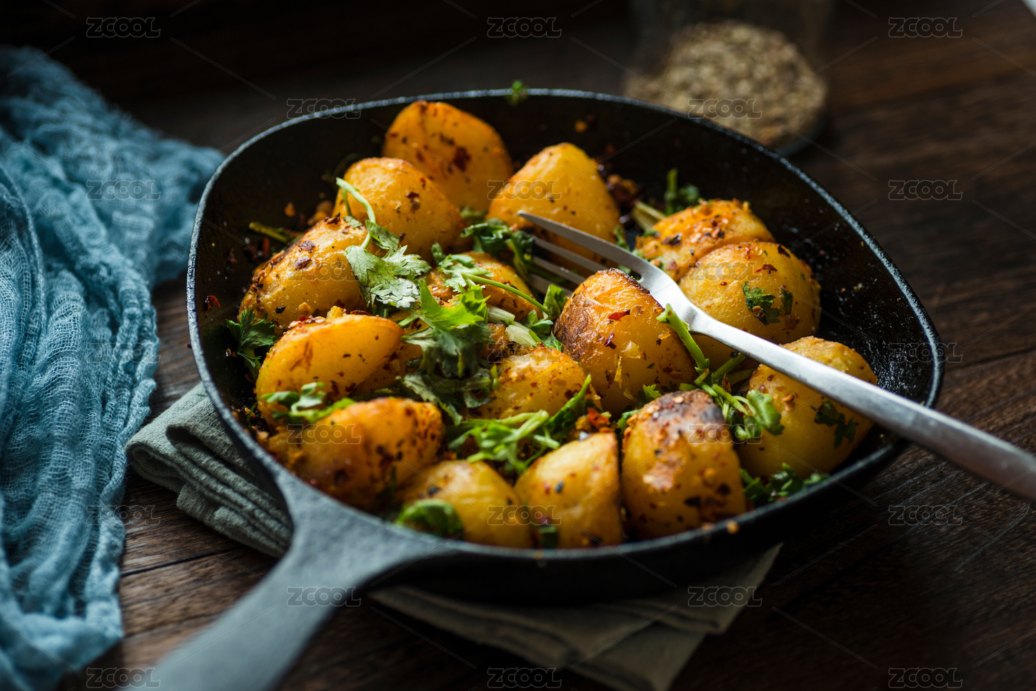 撒有香菜碎末的鐵鍋炕土豆