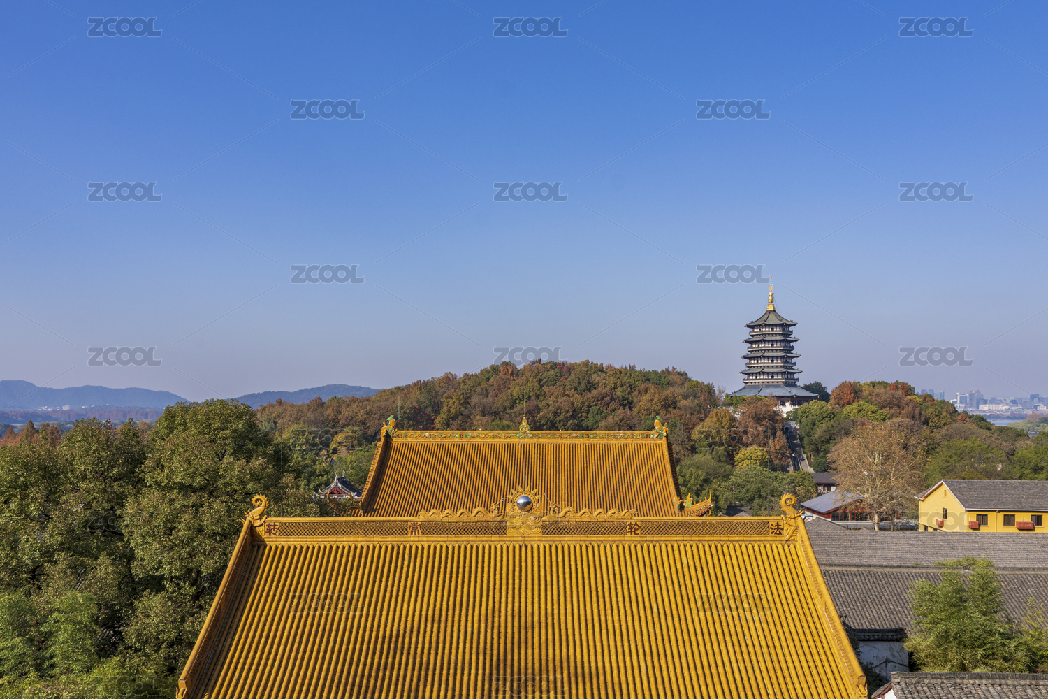 浙江省杭州市凈慈寺的屋頂與雷峰塔