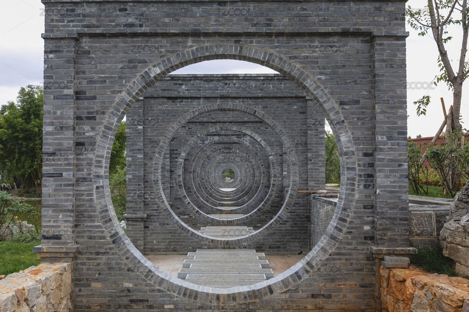 云南昆明大觀樓公園青磚墻圓形門(mén)