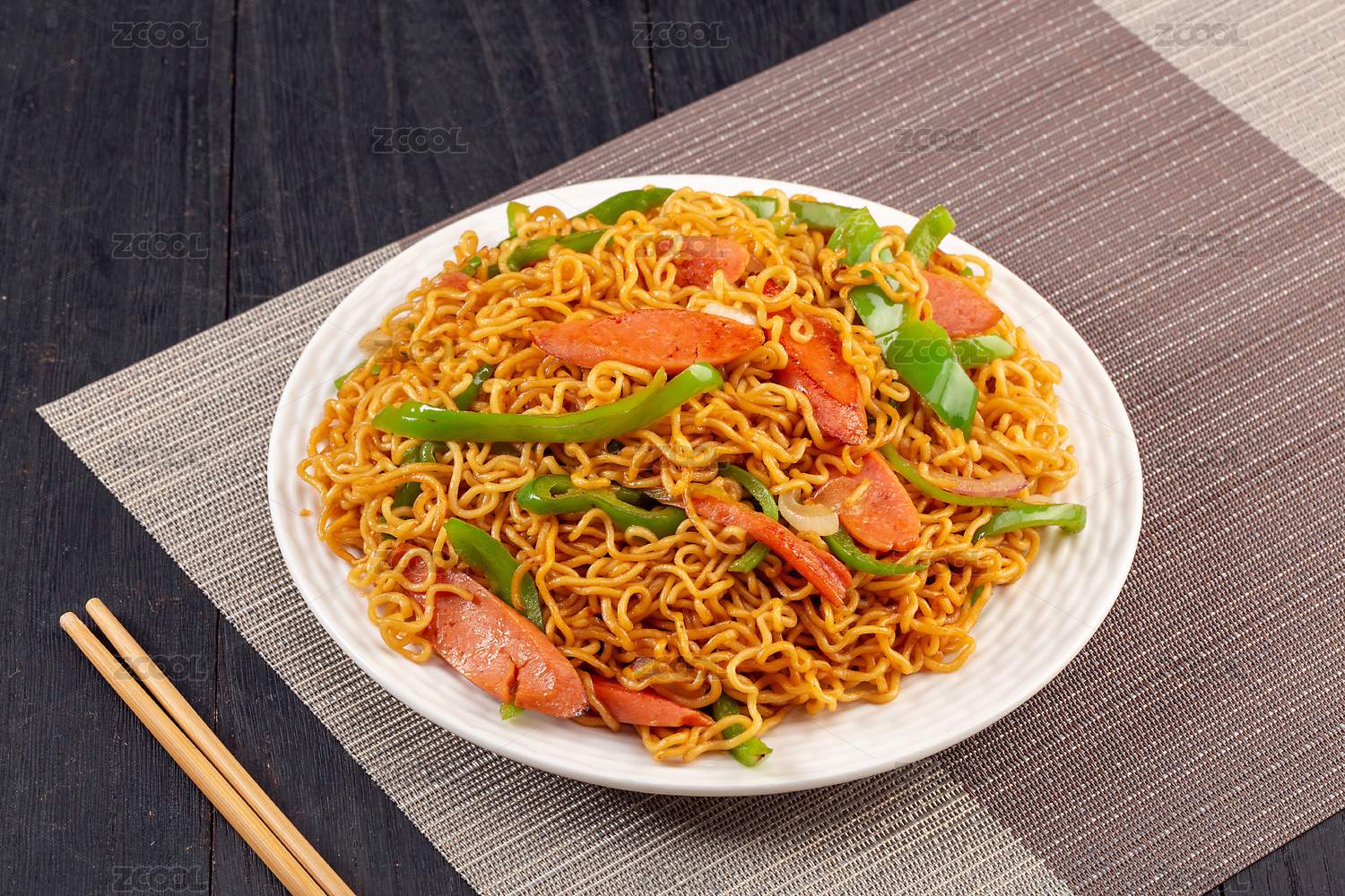 美味可口的洋蔥火腿腸配杭椒炒面