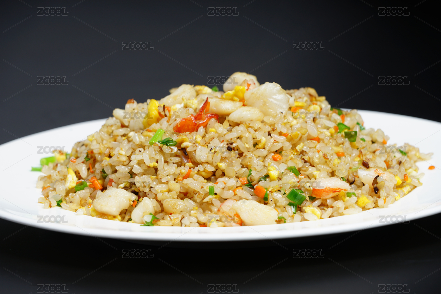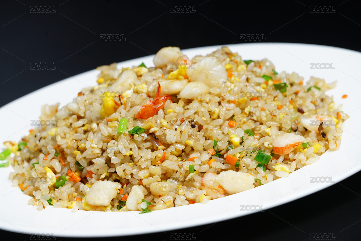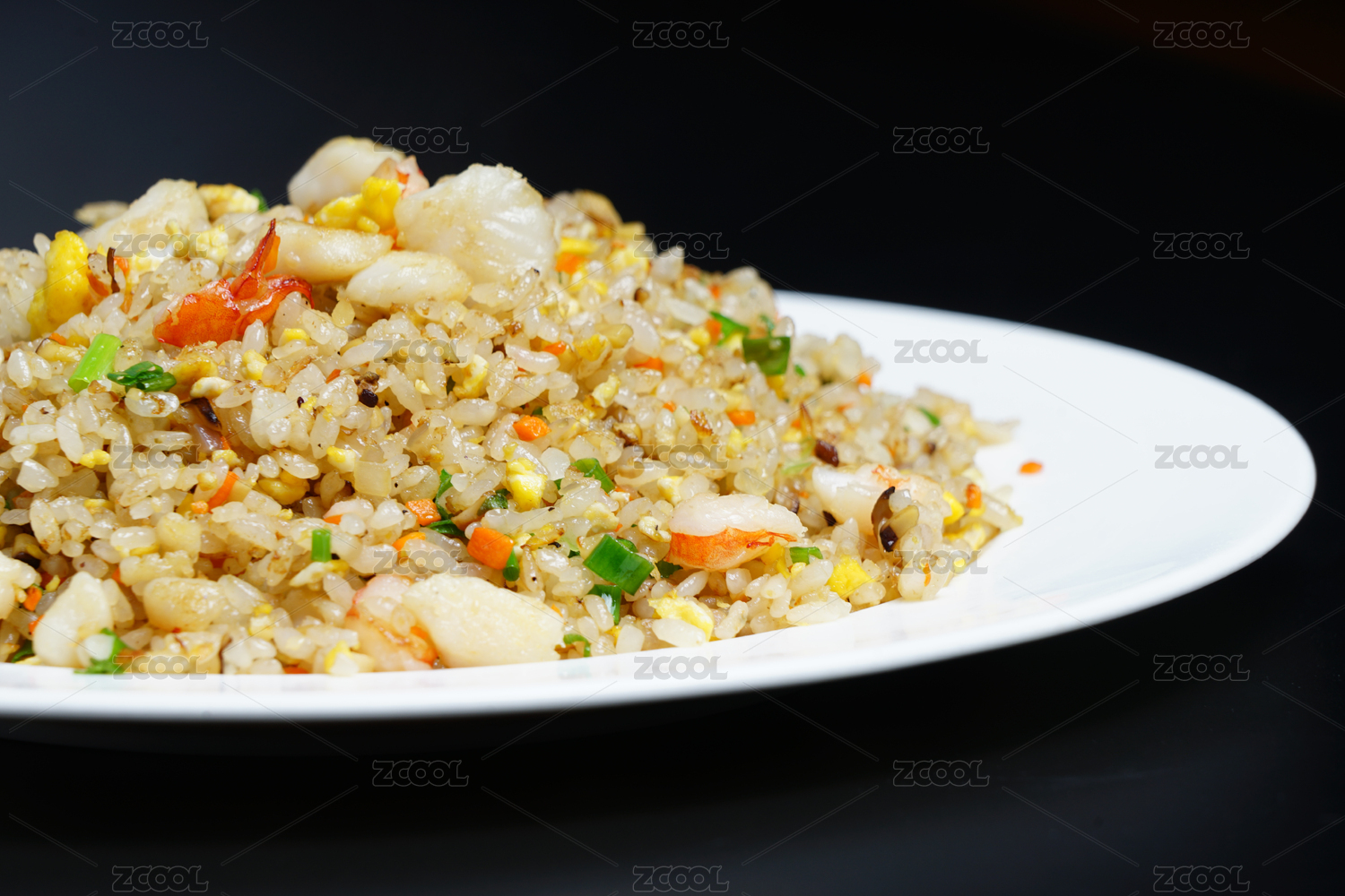黑色背景,白色盤子上一份蝦仁海鮮炒飯