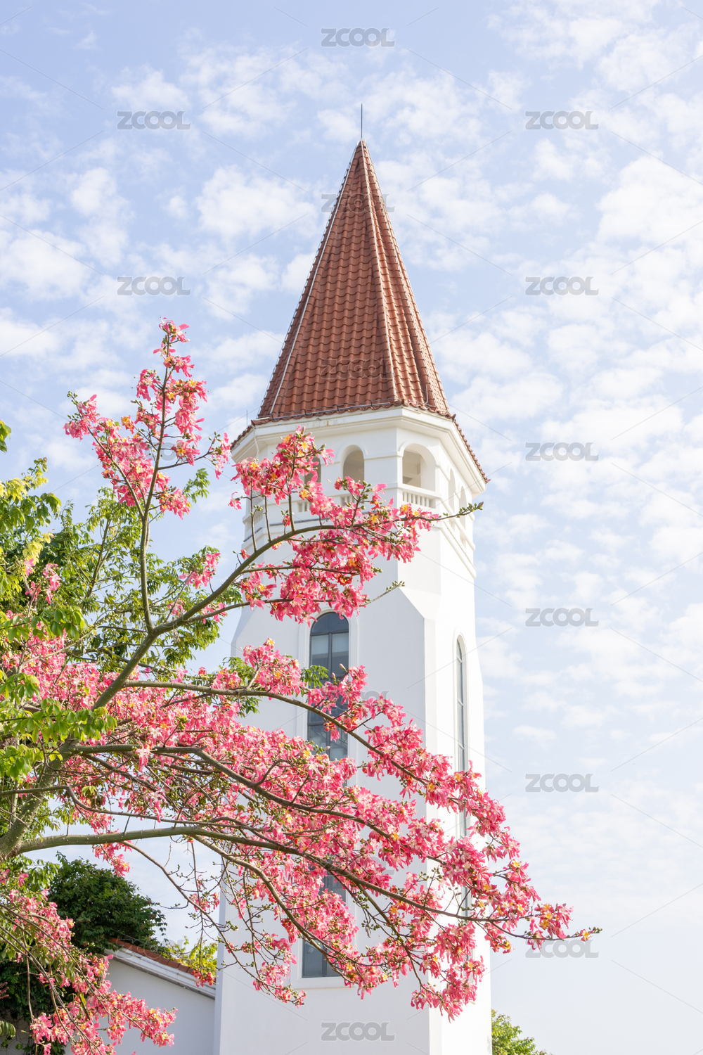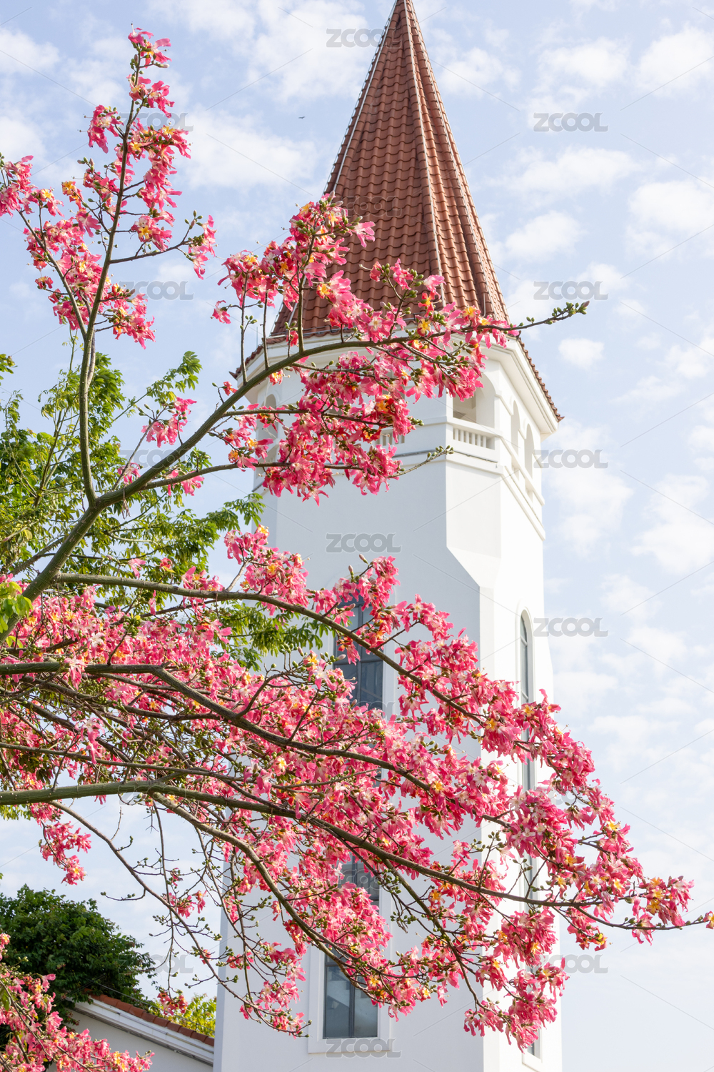 尖頂建筑前盛開(kāi)的美麗異木棉