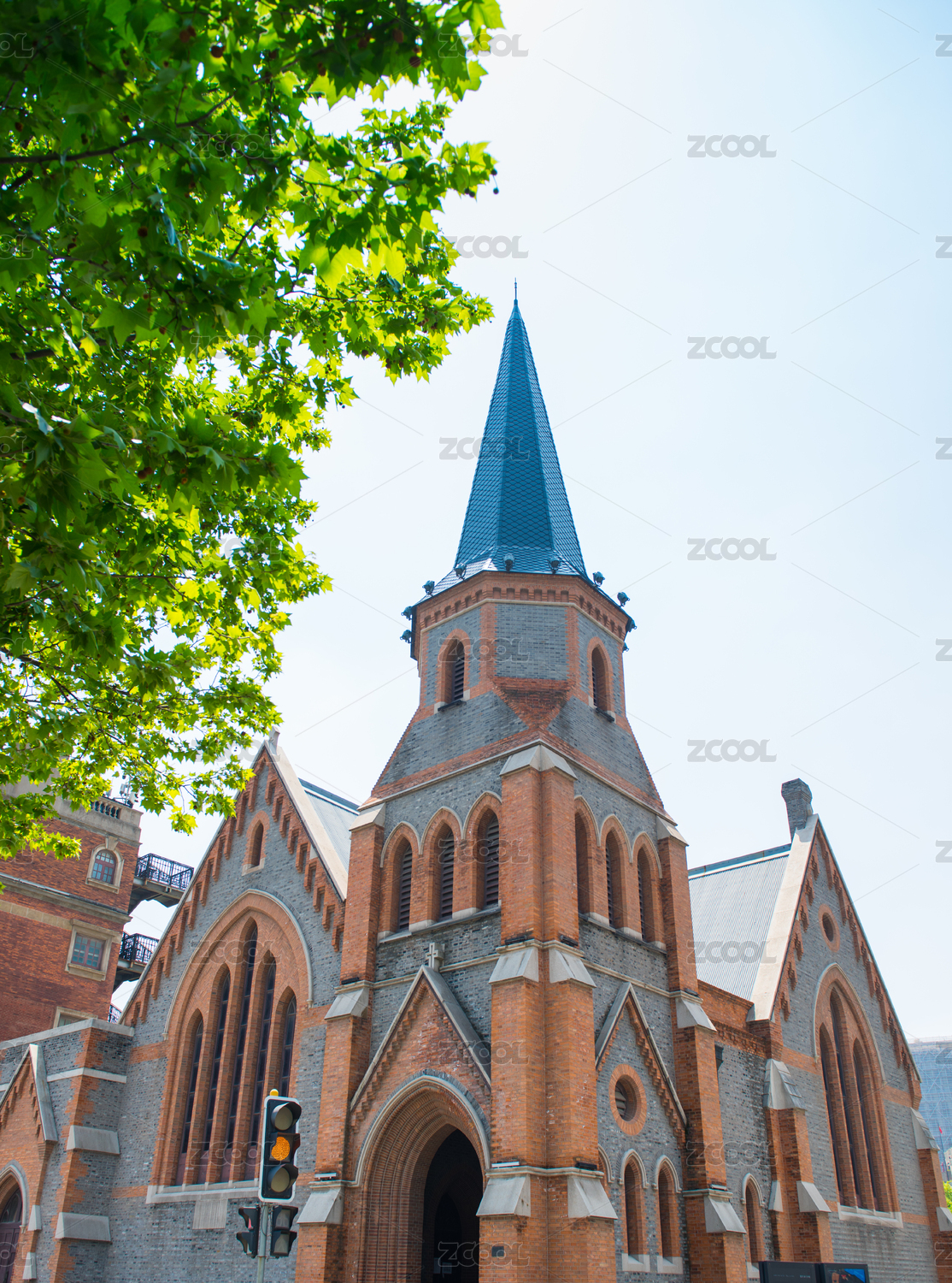 夏天的尖頂建筑和綠色的樹(shù)葉。