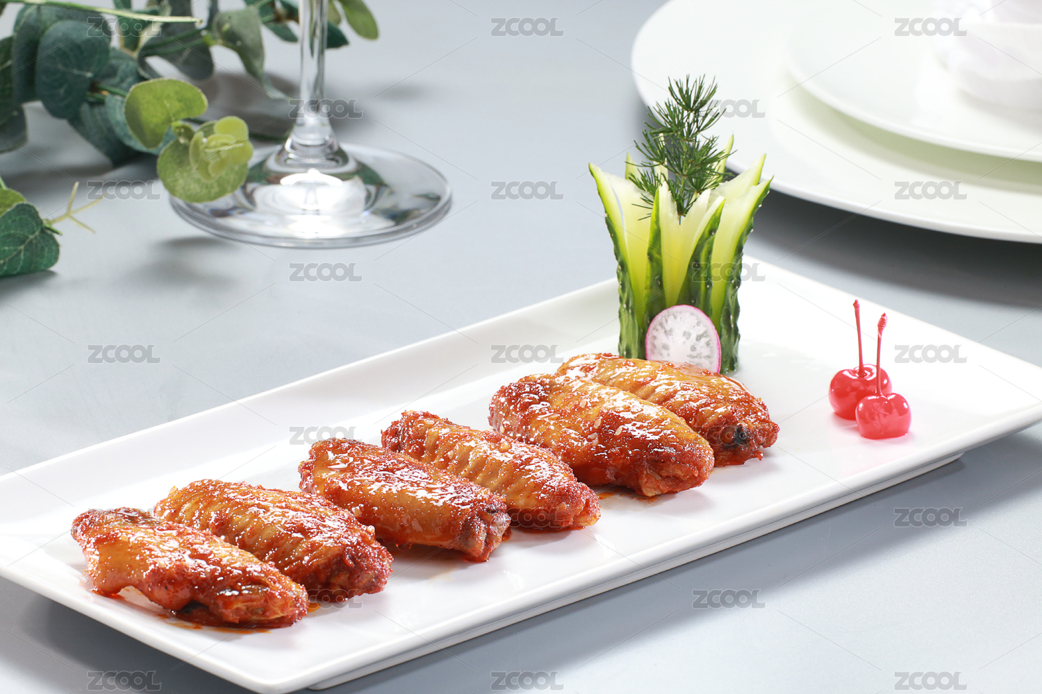 裝在盤子里的蜜汁烤翅中及生菜葉子