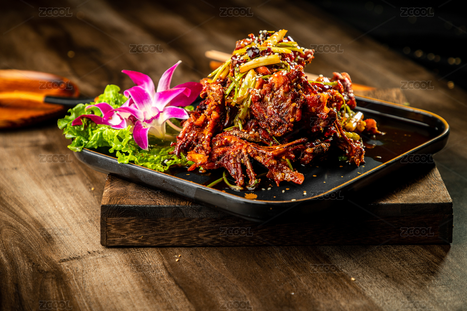 深色木板上擺放的辣炒雞