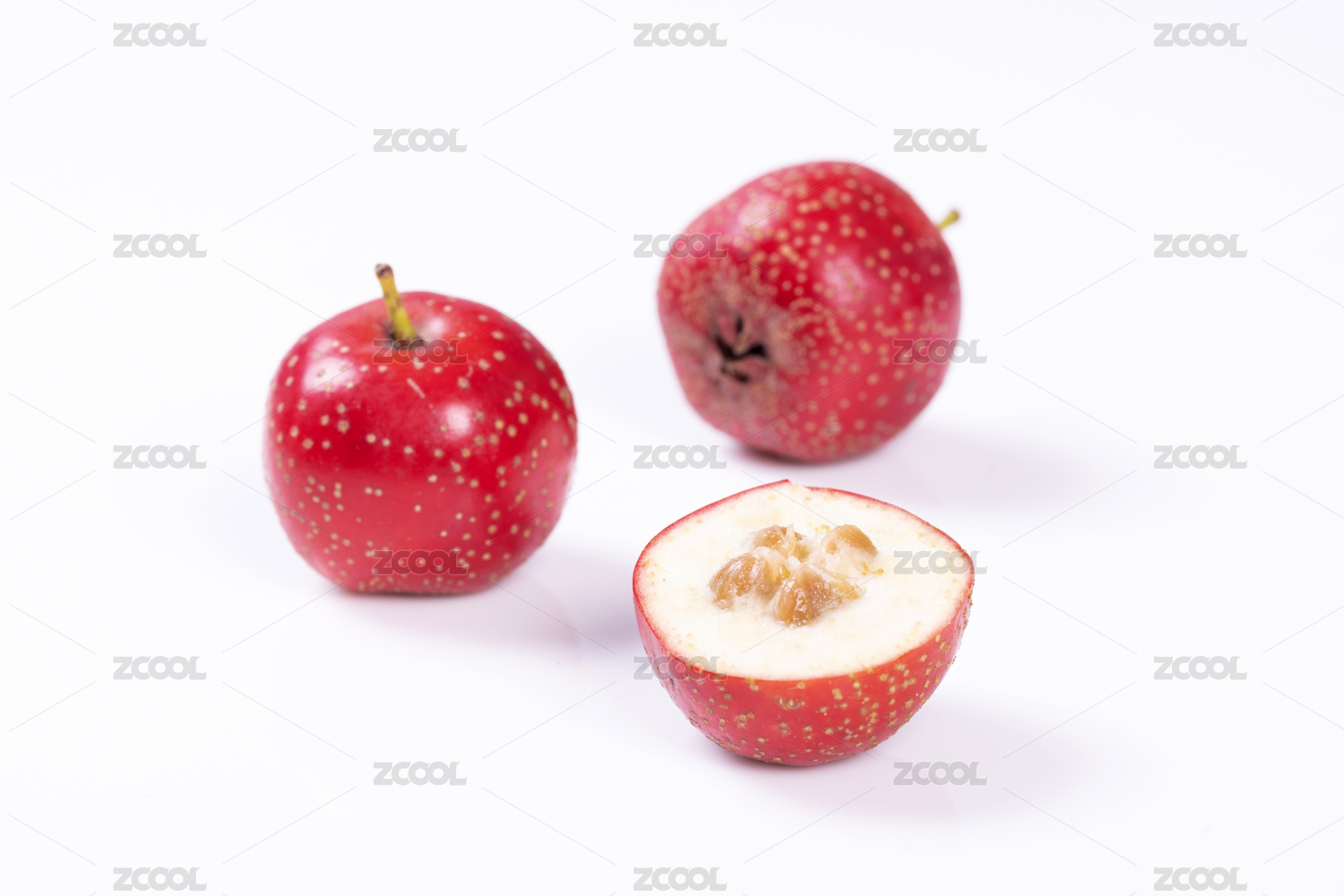 擺在白色背景里的紅山楂和山楂切面