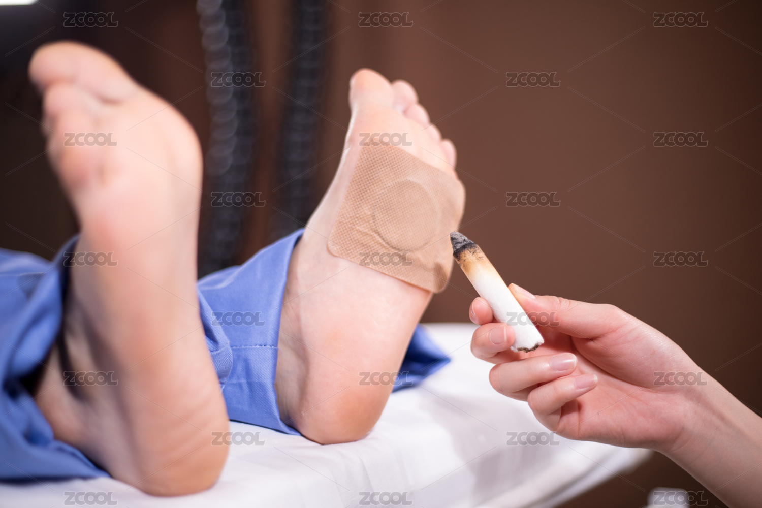 艾灸條燃燒著在患者足底部