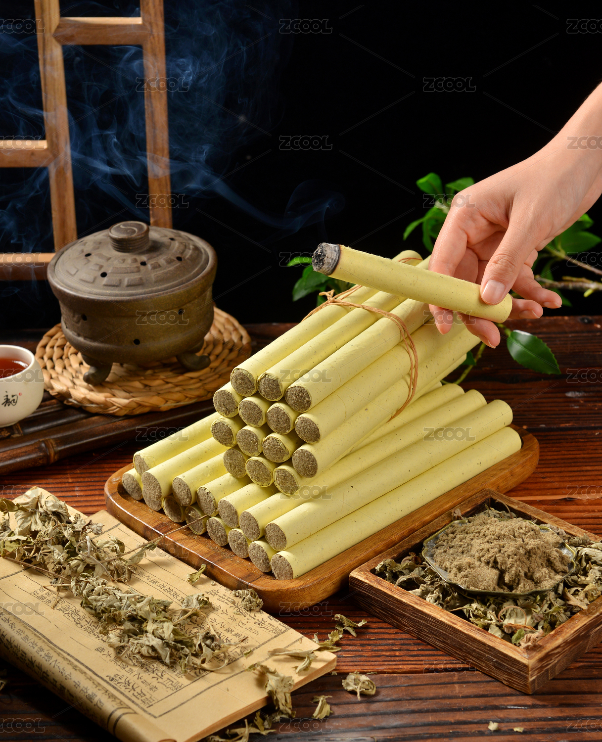 特寫木桌上放著點(diǎn)燃著的艾灸條