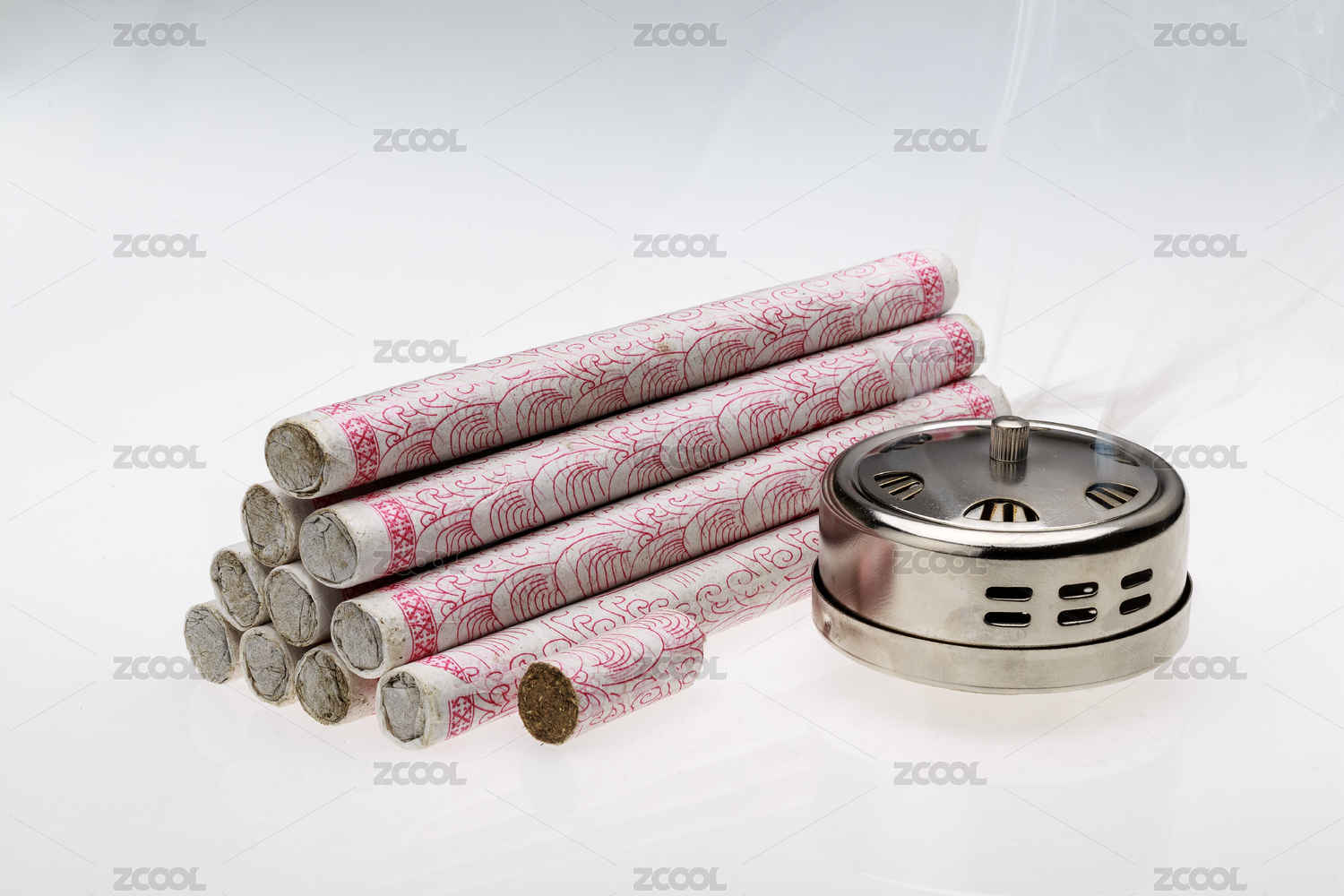 白色背景上中藥材艾灸條和不銹鋼艾灸理療盒