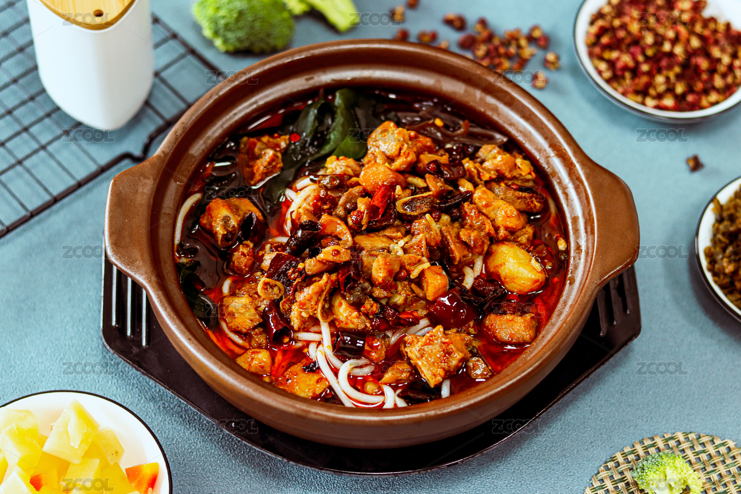 黑色砂鍋煲里的辣子雞砂鍋米線