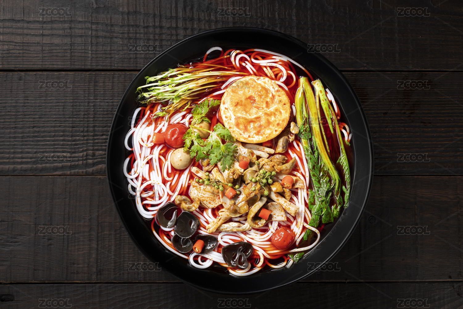 黑色大碗里的麻辣紅湯滑肉片米線米粉