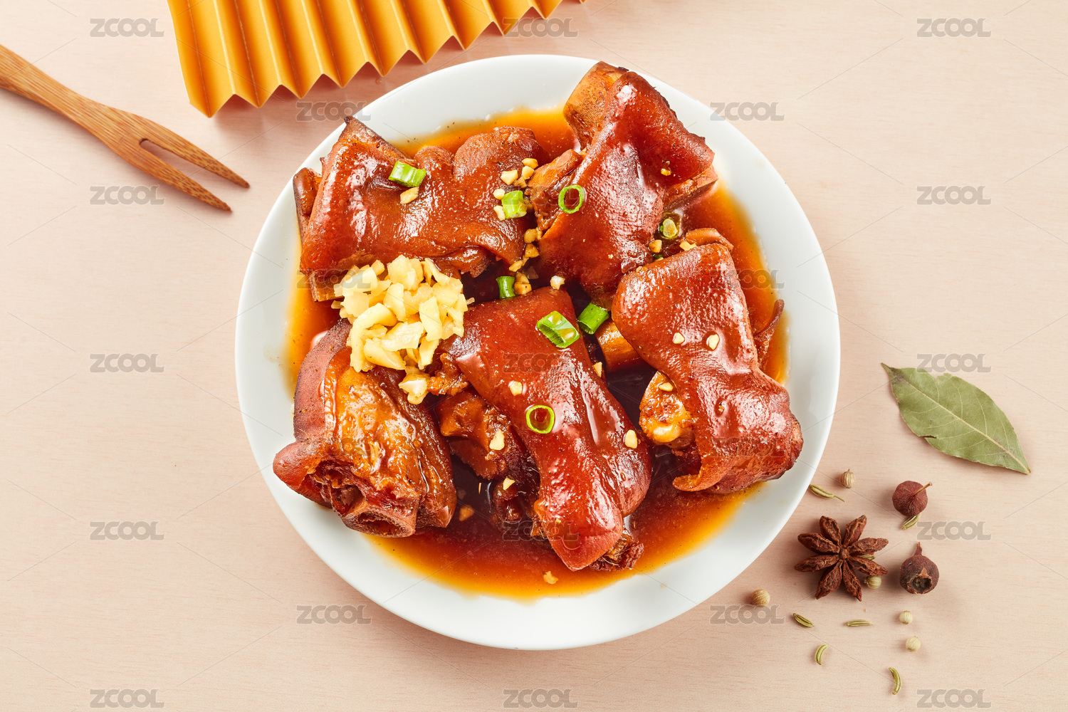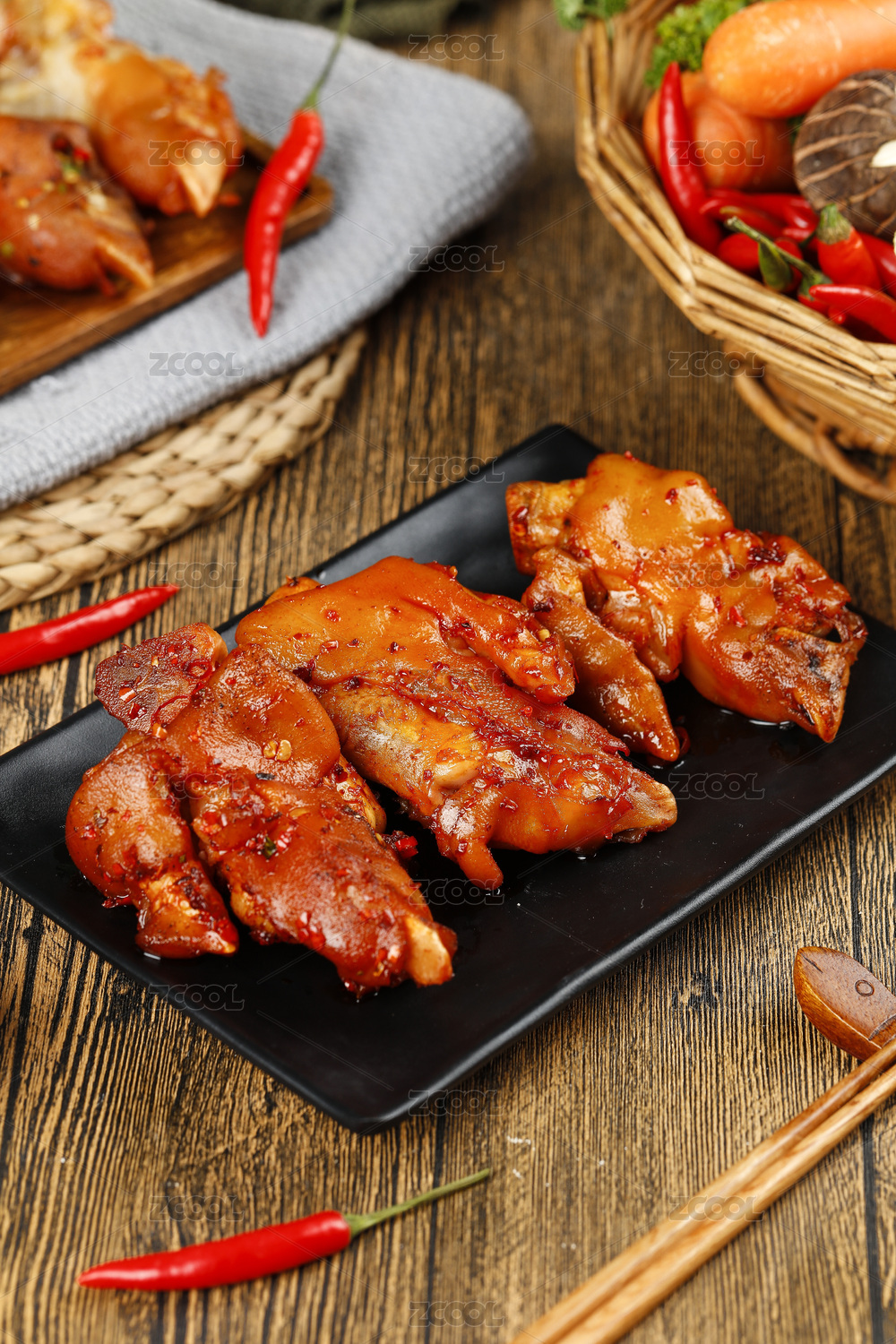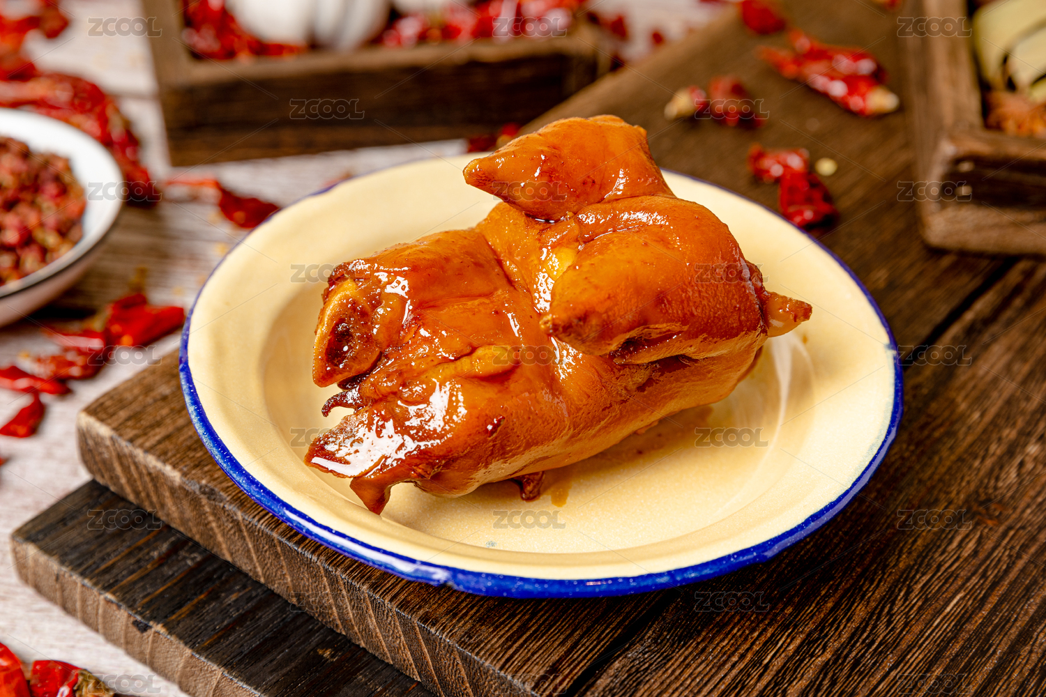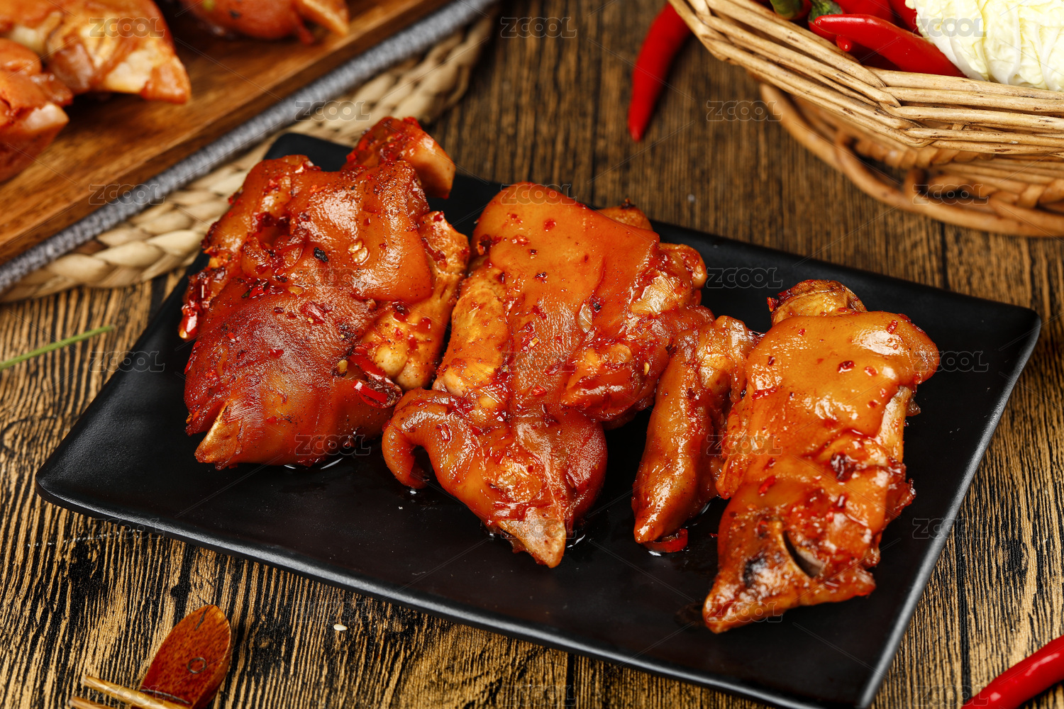 木底上放著一盤(pán)香辣鹵豬蹄