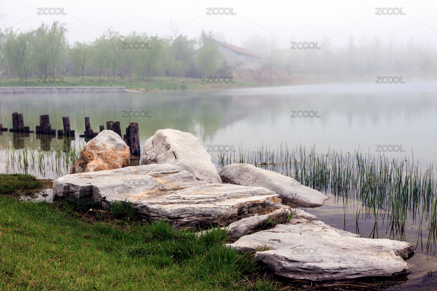 巖石后面霧氣彌漫的溪流水面