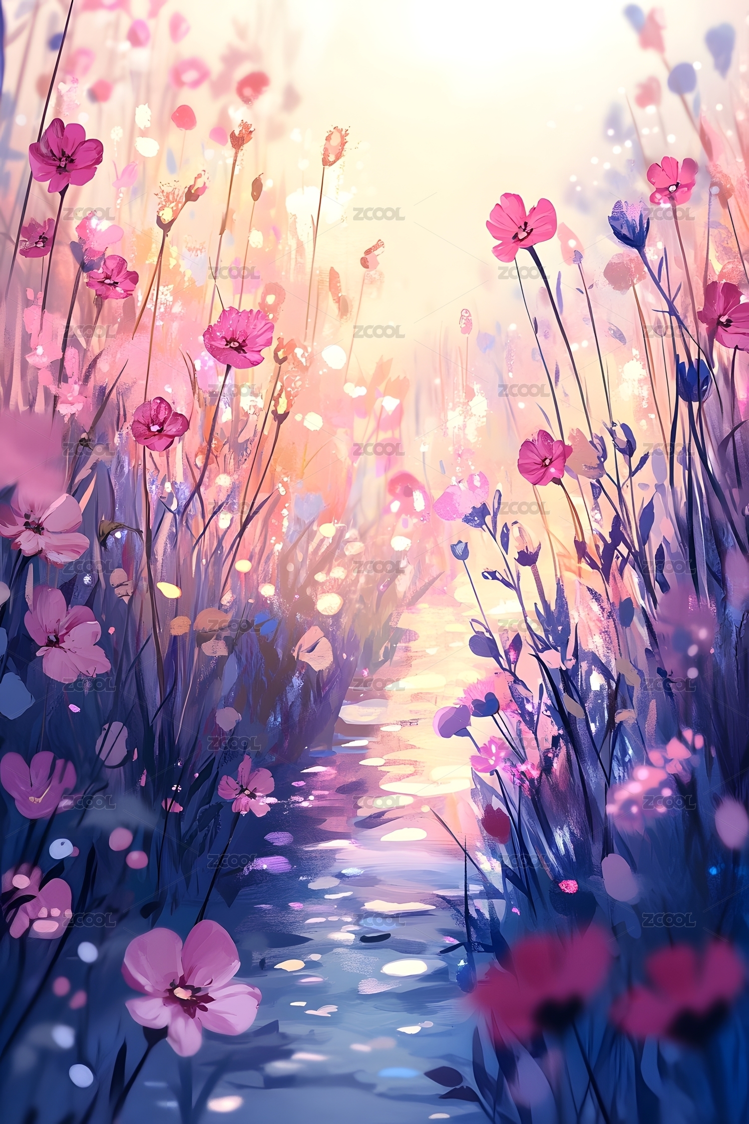 陽光下的山谷溪流與搖曳野花