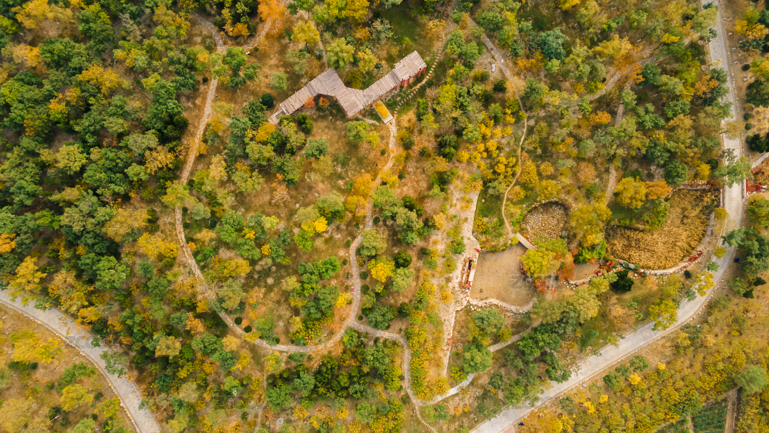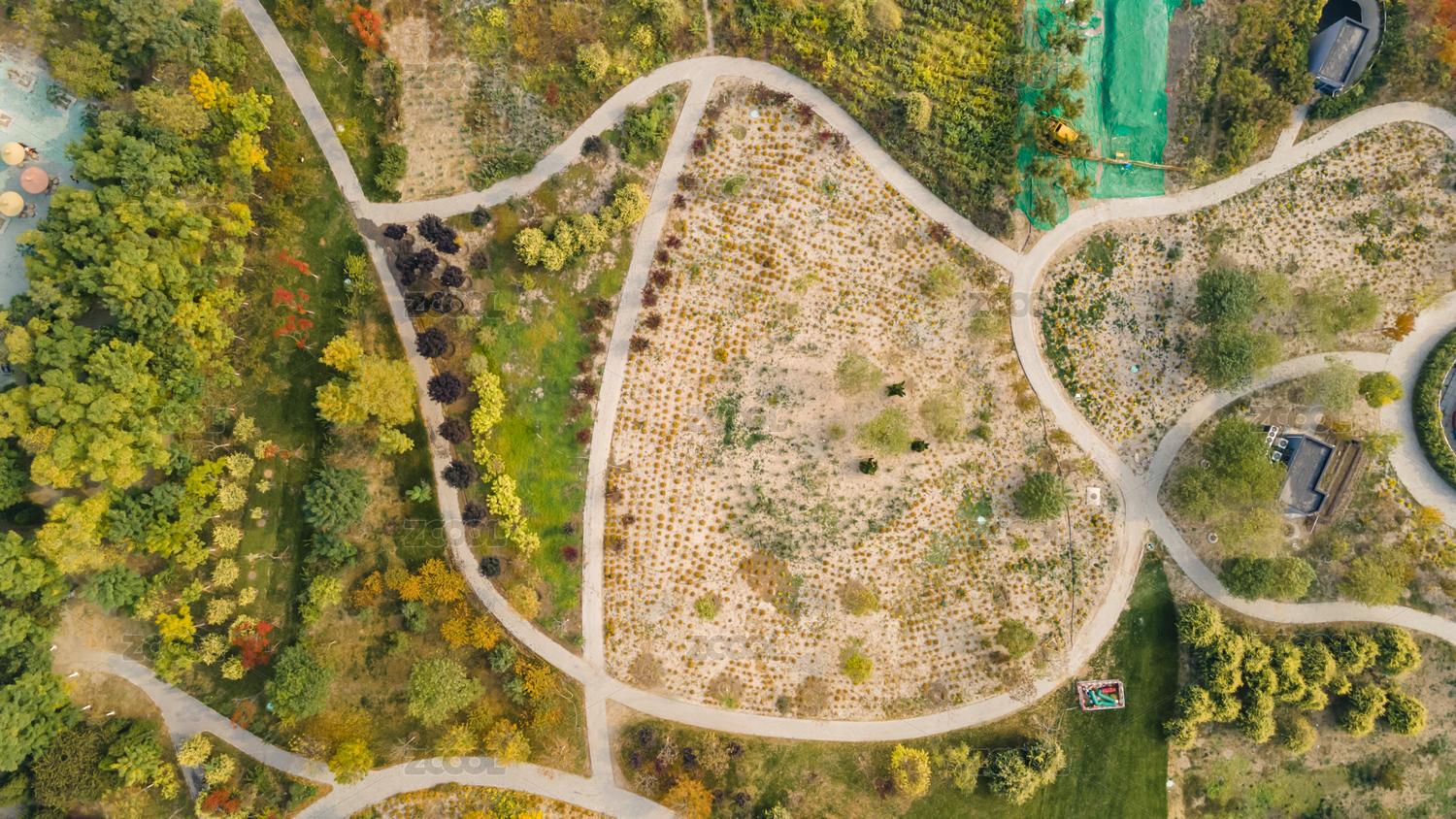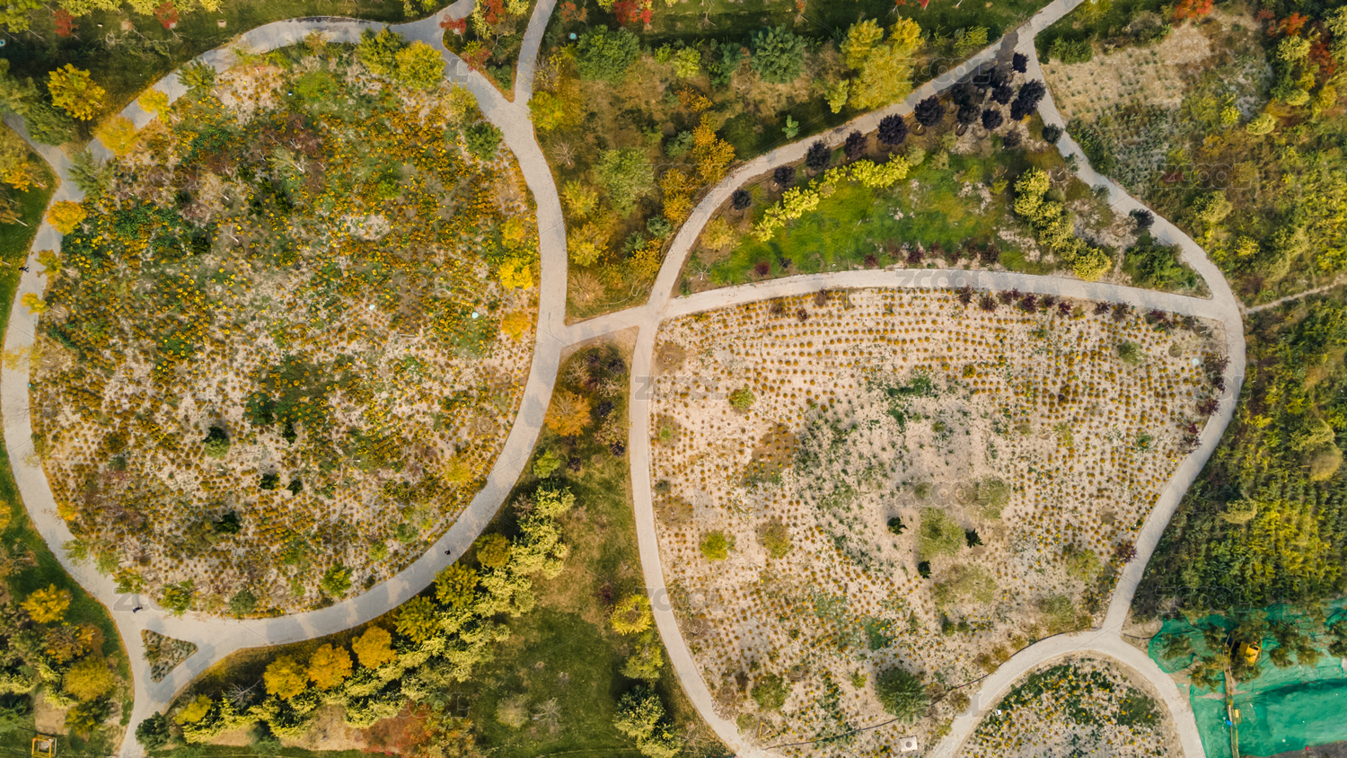 中國天津紫云公園秋天黃葉航拍俯視圖