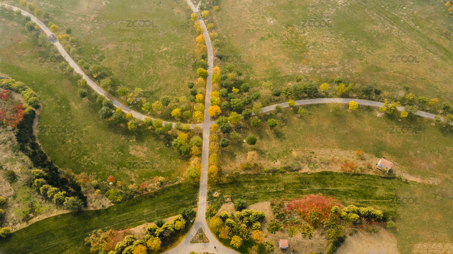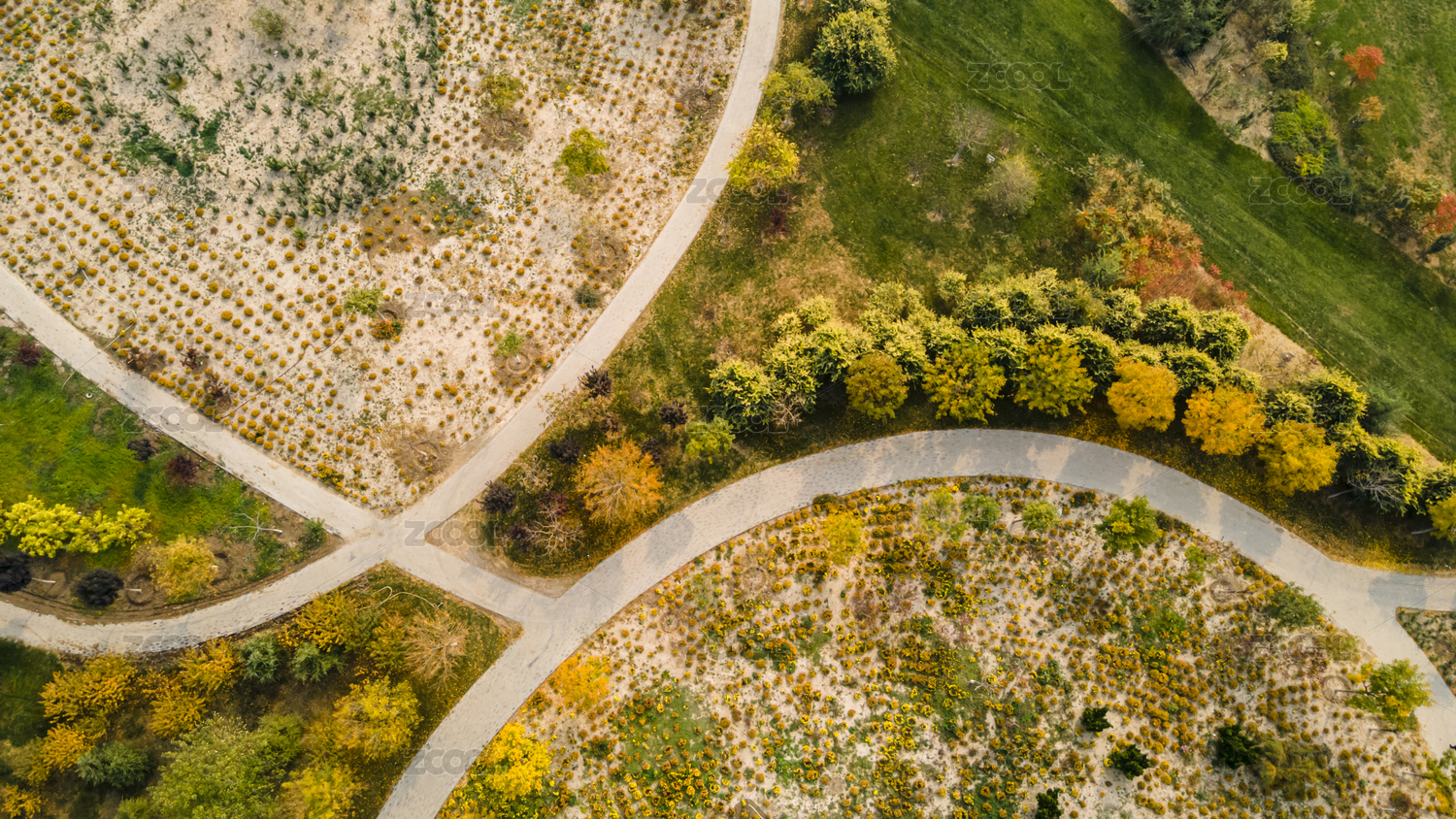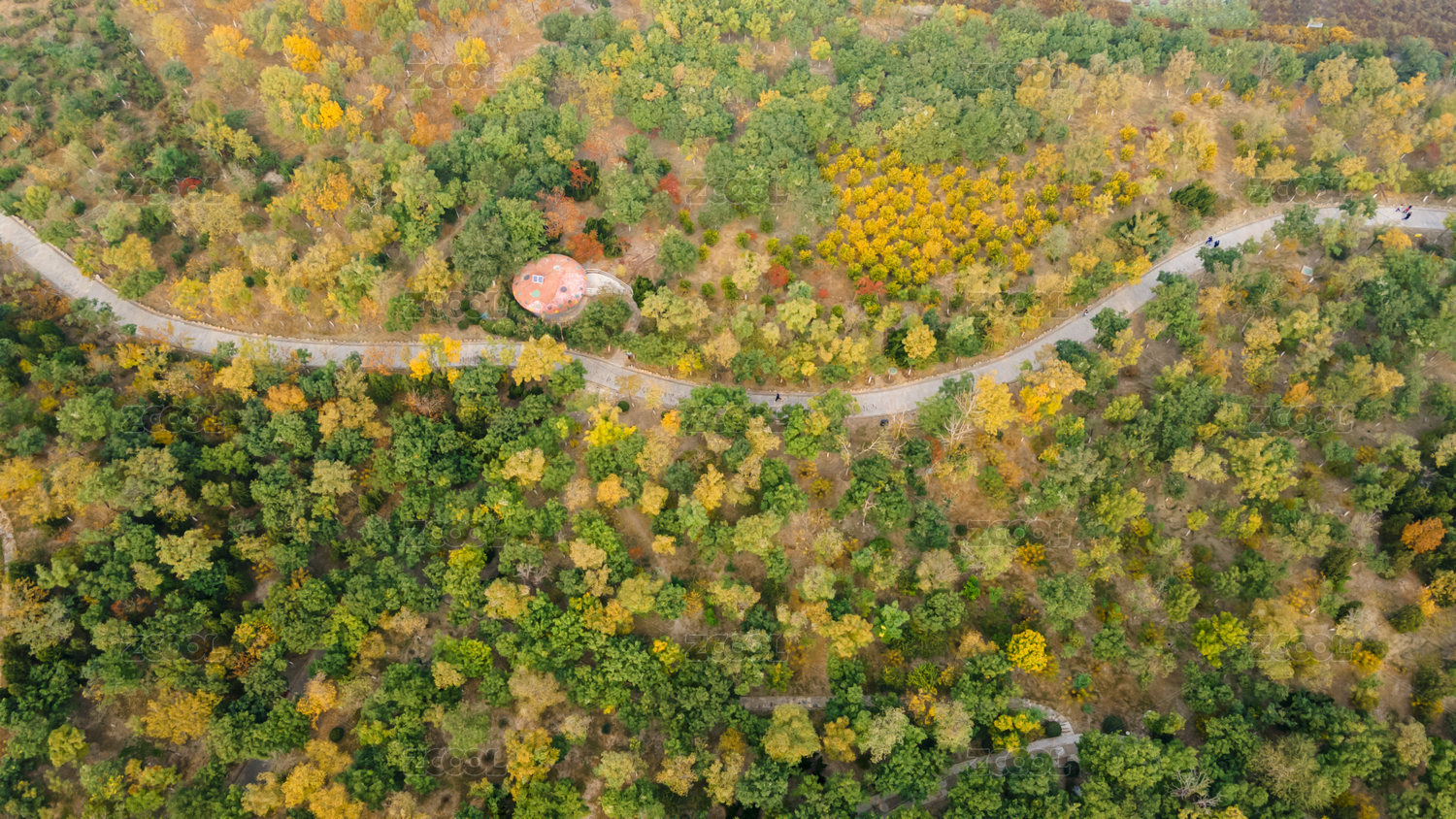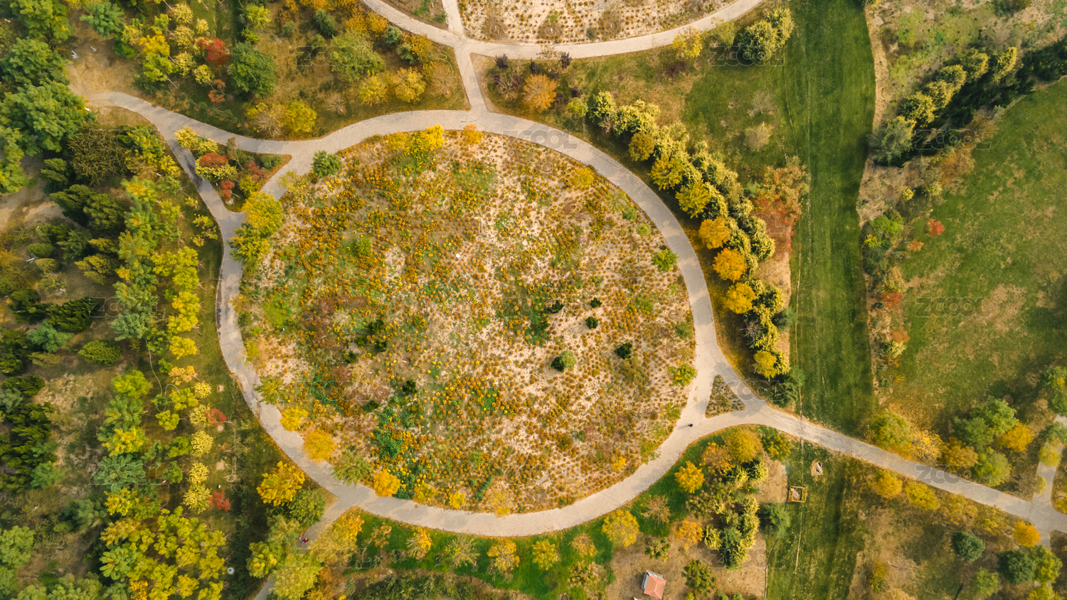 中國天津紫云公園秋天黃葉航拍俯視圖