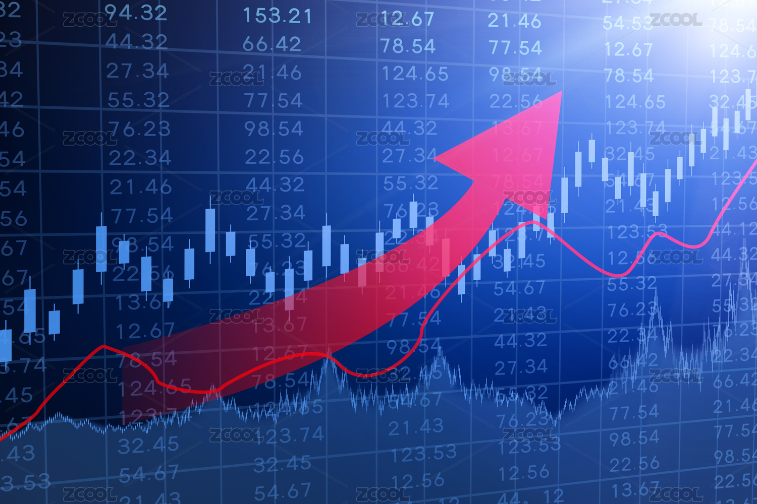 一個寫滿股市股票大數(shù)據(jù)的股票大盤和向上的箭頭上漲的趨勢走勢經(jīng)濟財經(jīng)行情大漲漲幅牛市概念