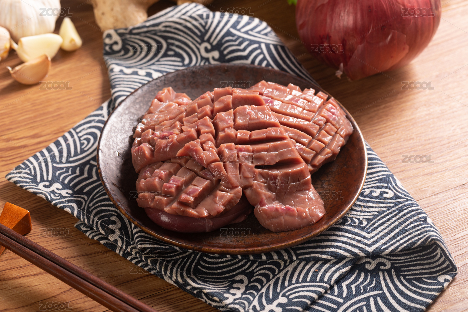 木桌子上切好裝在盤子中的新鮮豬腰花