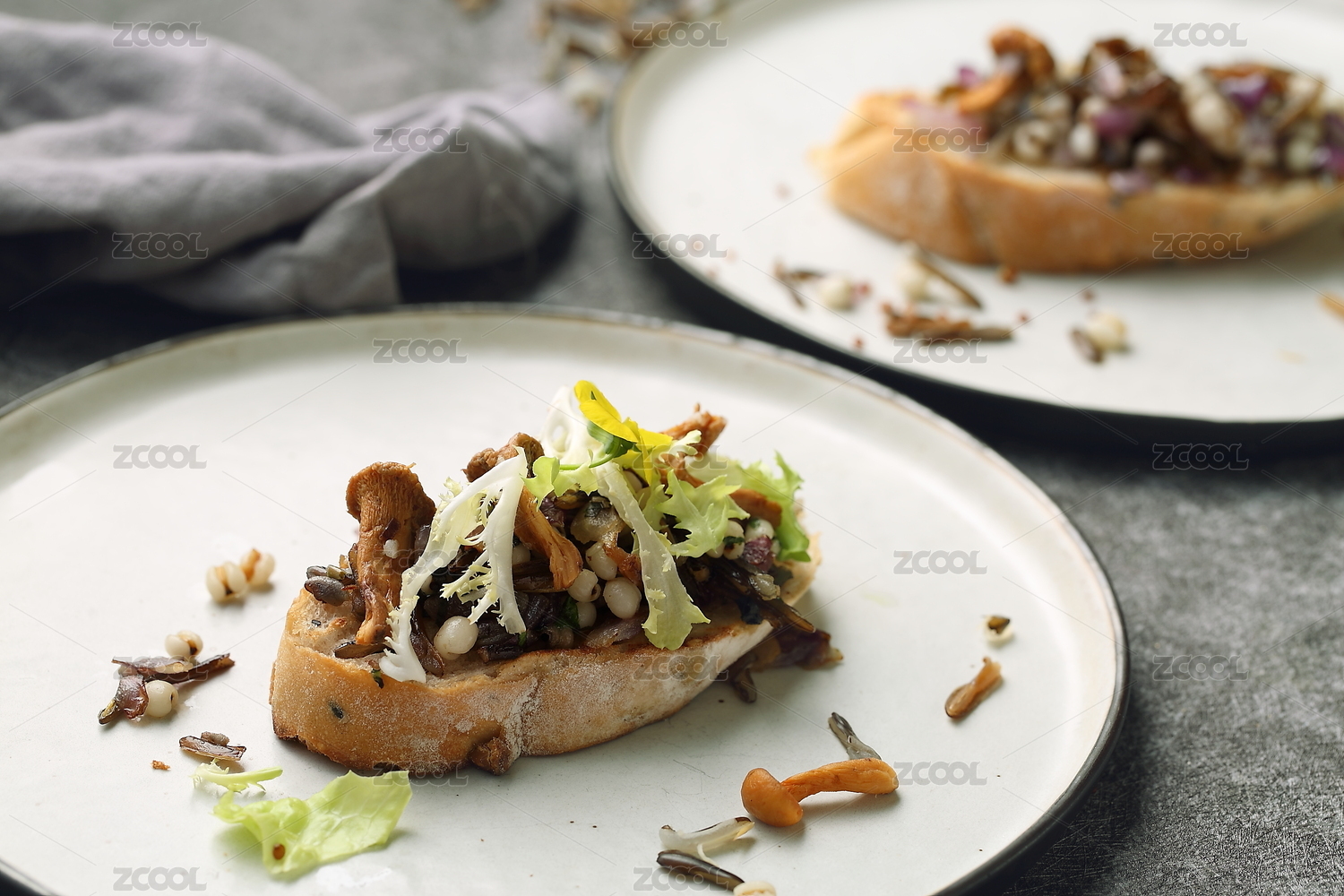 平圓盤上的法式料理脆面包片上加蔬菜沙拉