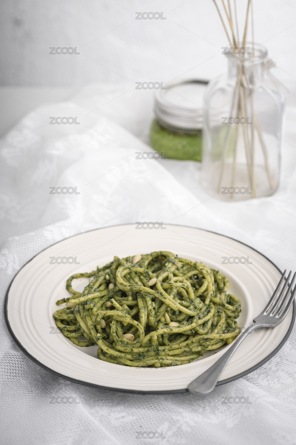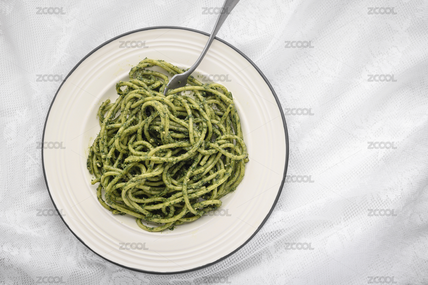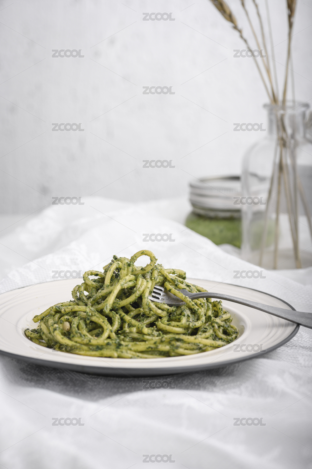 白色盤子里的青醬意大利面